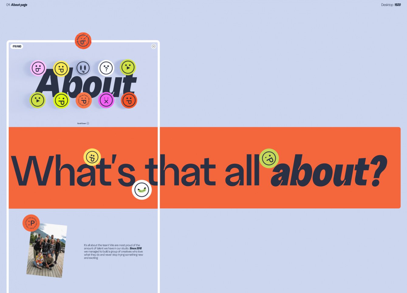 Основными элементами нового стиля стали смайлики и формы, которые образутся из элементов логотипа компании и интерфеса видео, которые PRAND создает. Мы добавили больше ярких цветов и необычных форм, чтобы разнообразить все разделы сайта по максимуму — на главной странице у нас плавают улыбающиеся кнопки, в меню катается веселая рожица, а на странице "О компании" эти смайлики превратились в 3D-модели и реагируют на курсор каждый по-своему (это стоит увидеть).