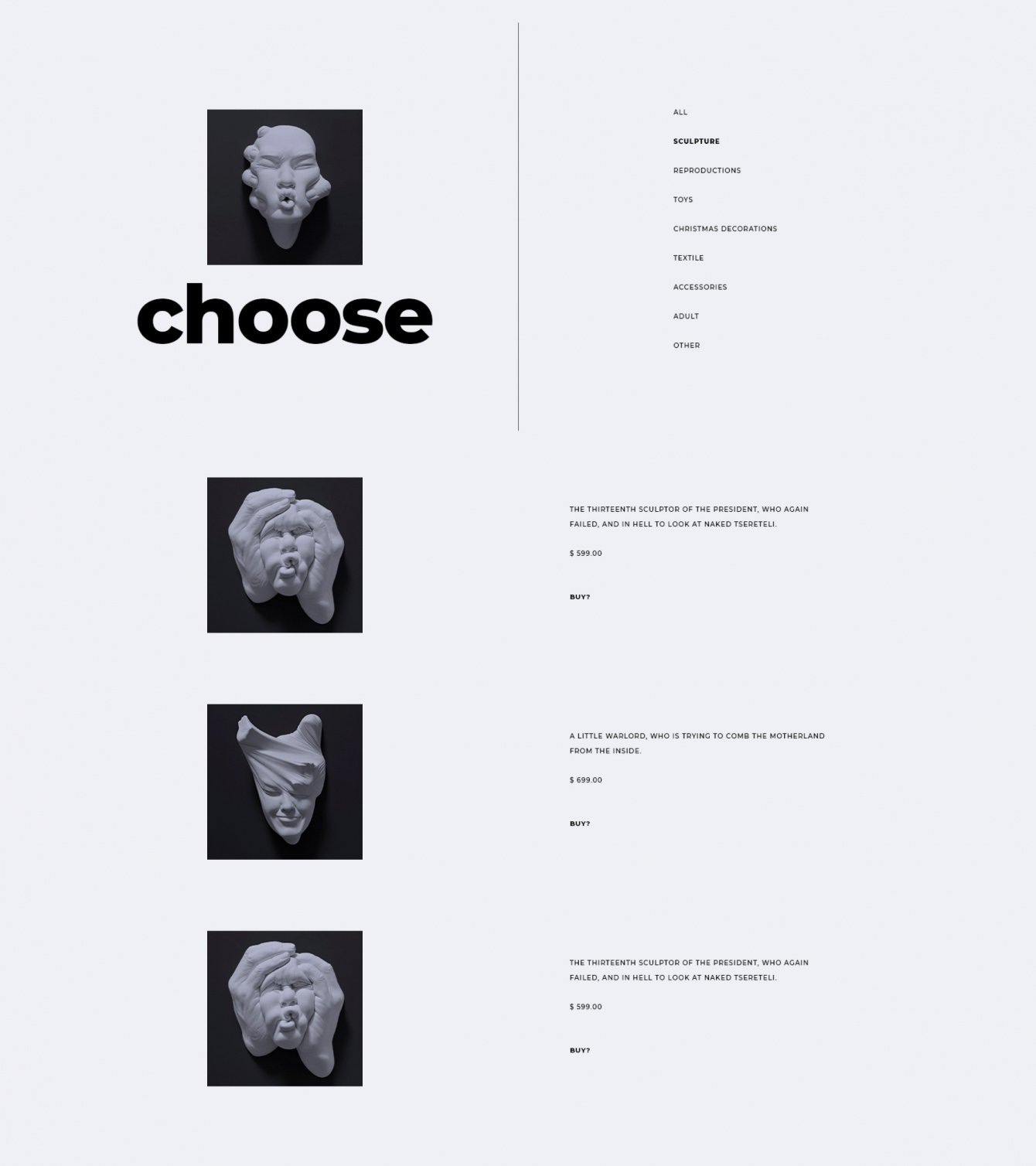 Картинки–тизеры, в которых видно лишь часть изображения, постоянная двусмысленность, заголовки–загадки, антитеза гипертрофированного непропорционального шрифта и относительно маленьких картинок, напоминающих офорты на стене картинной галереи. Не хватает только проводника по лабиринтам этого сайта в образе постоянно ускользающего от вас Чеширского кота.