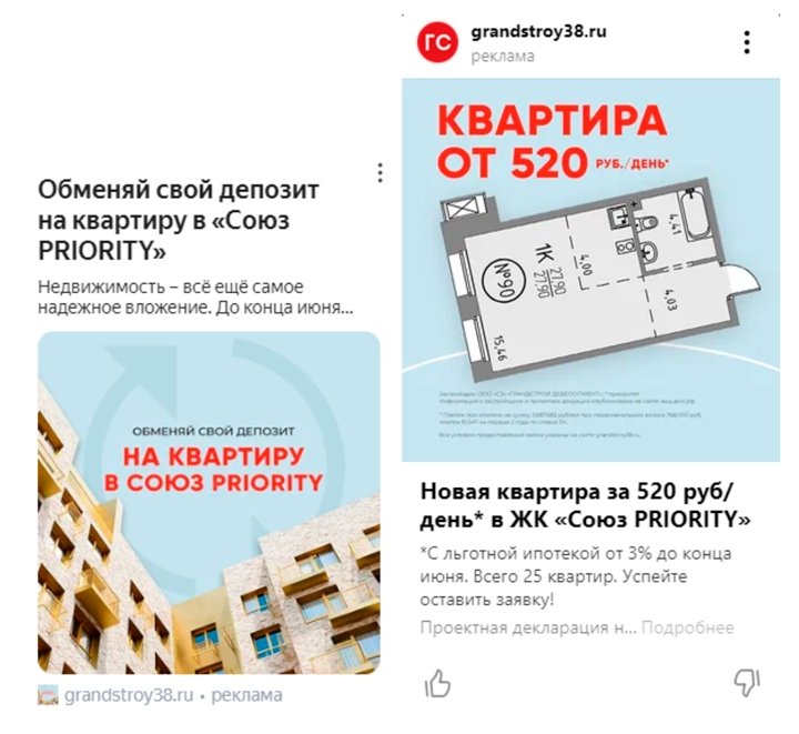 Ретаргетинг был настроен на пользователей уже бывших на сайте, но не оставивших заявку. Им показывали различные креативы с новостями и предложениями от застройщика: рассрочка, ипотека, ввод в эксплуатацию новых блок секций и т.д. ведущие на разные страницы сайта для тестирования конверсии.
