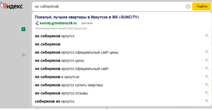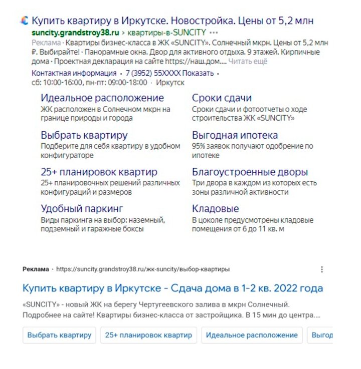 В этой РК показ был настроен по запросам ЖК-конкурентов, находившихся рядом или в той же ценовой категории. Изначально объявления были такими же как и в рекламной кампании с горячими запросами, но со второго месяца мы их изменили и настроили корректировки для показа в поисковых подсказках: