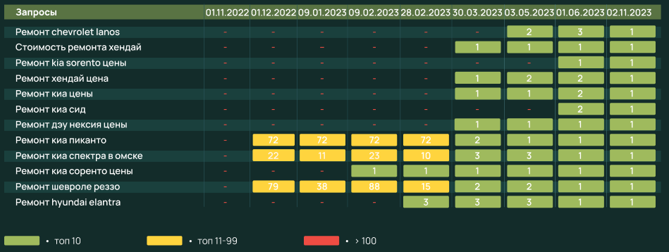 - вывести в топ такие запросы, как "стоимость запроса хендай" и подобные.