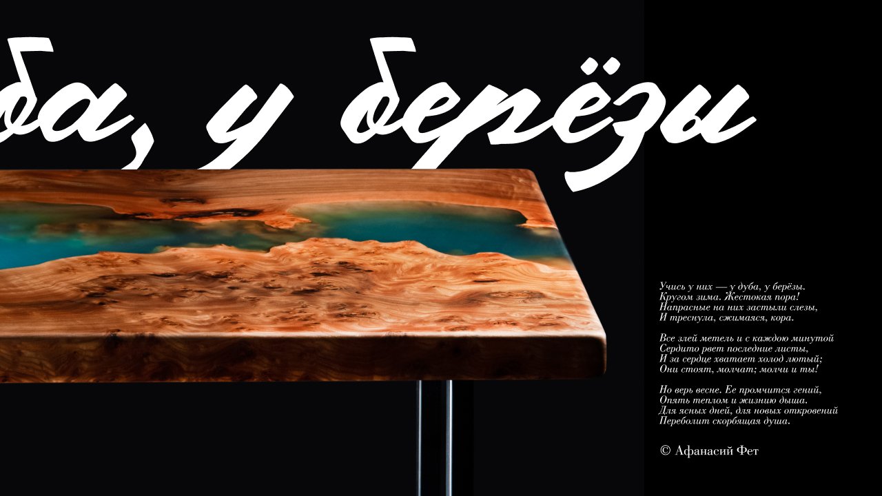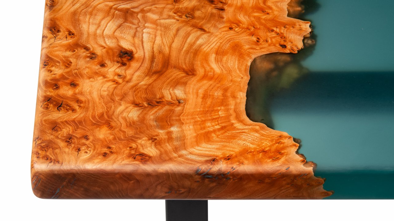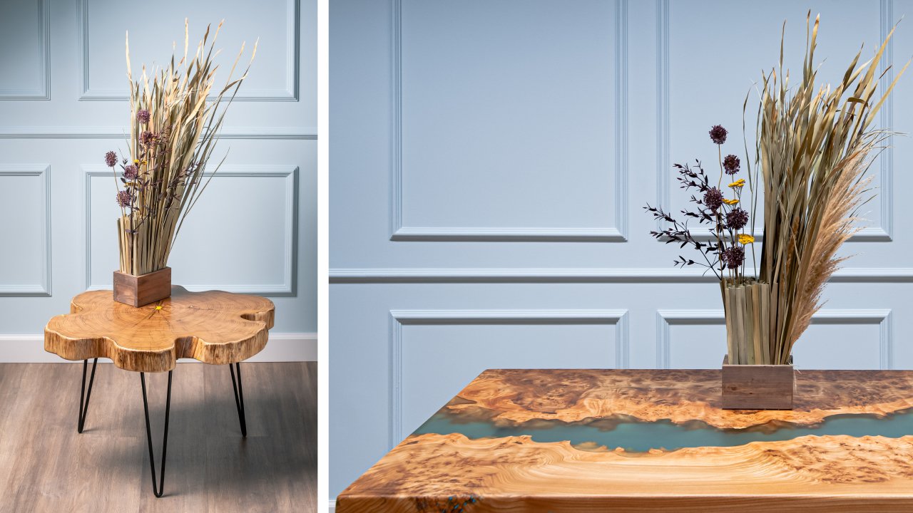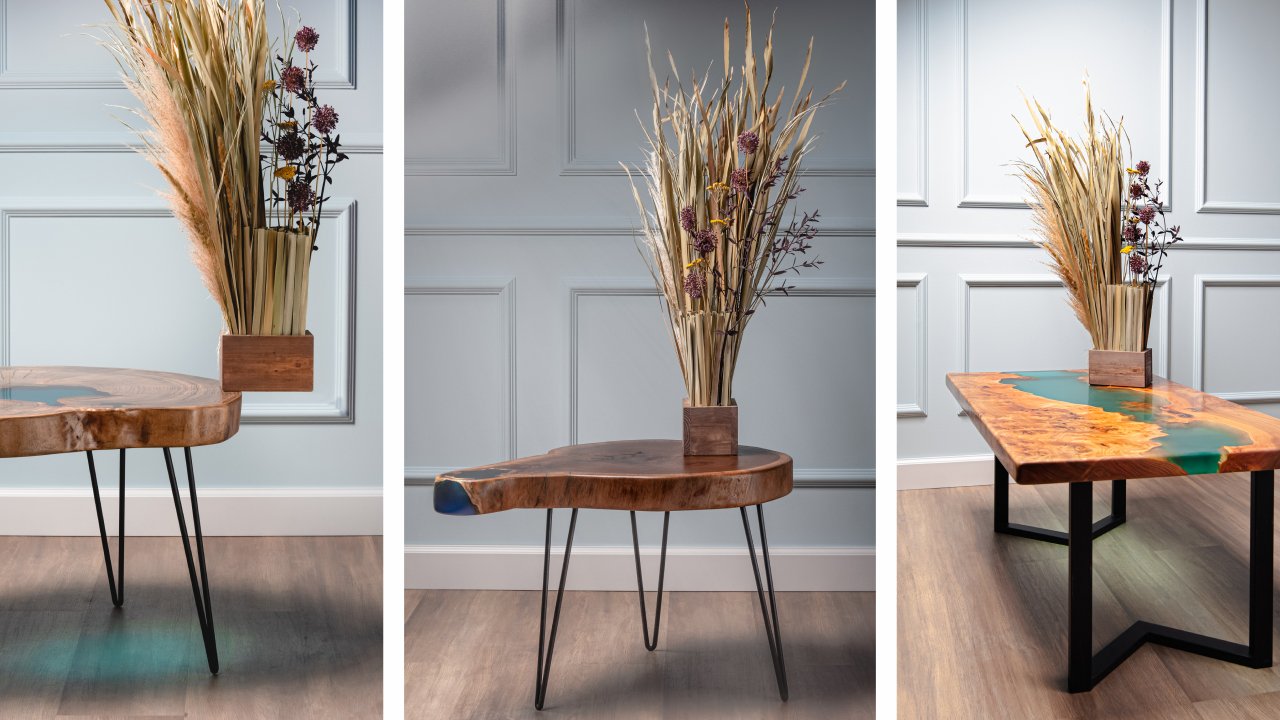 Создать визуальный контент для каталога и социальных сетей, который подчеркнёт премиальный характер мебели ручной работы и эстетическую ценность сочетания дерева и эпоксидной смолы.