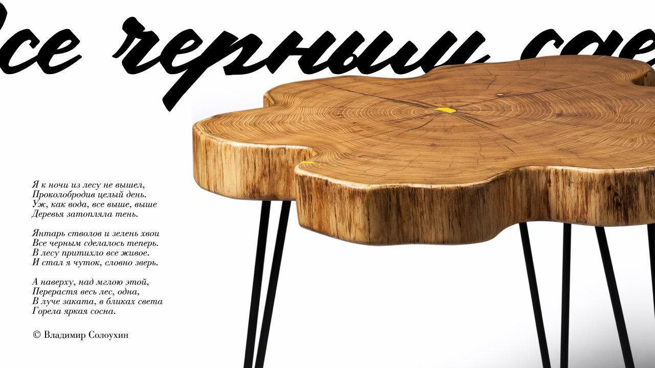 Основной акцент был сделан на деталях и фактурах: крупные планы раскрыли глубину древесных колец, блеск застывшей смолы и плавность линий. Освещение и композиция помогли показать уникальный дизайн и качество обработки, а общая стилистика съёмки погрузила зрителя в атмосферу современного премиум-интерьера.