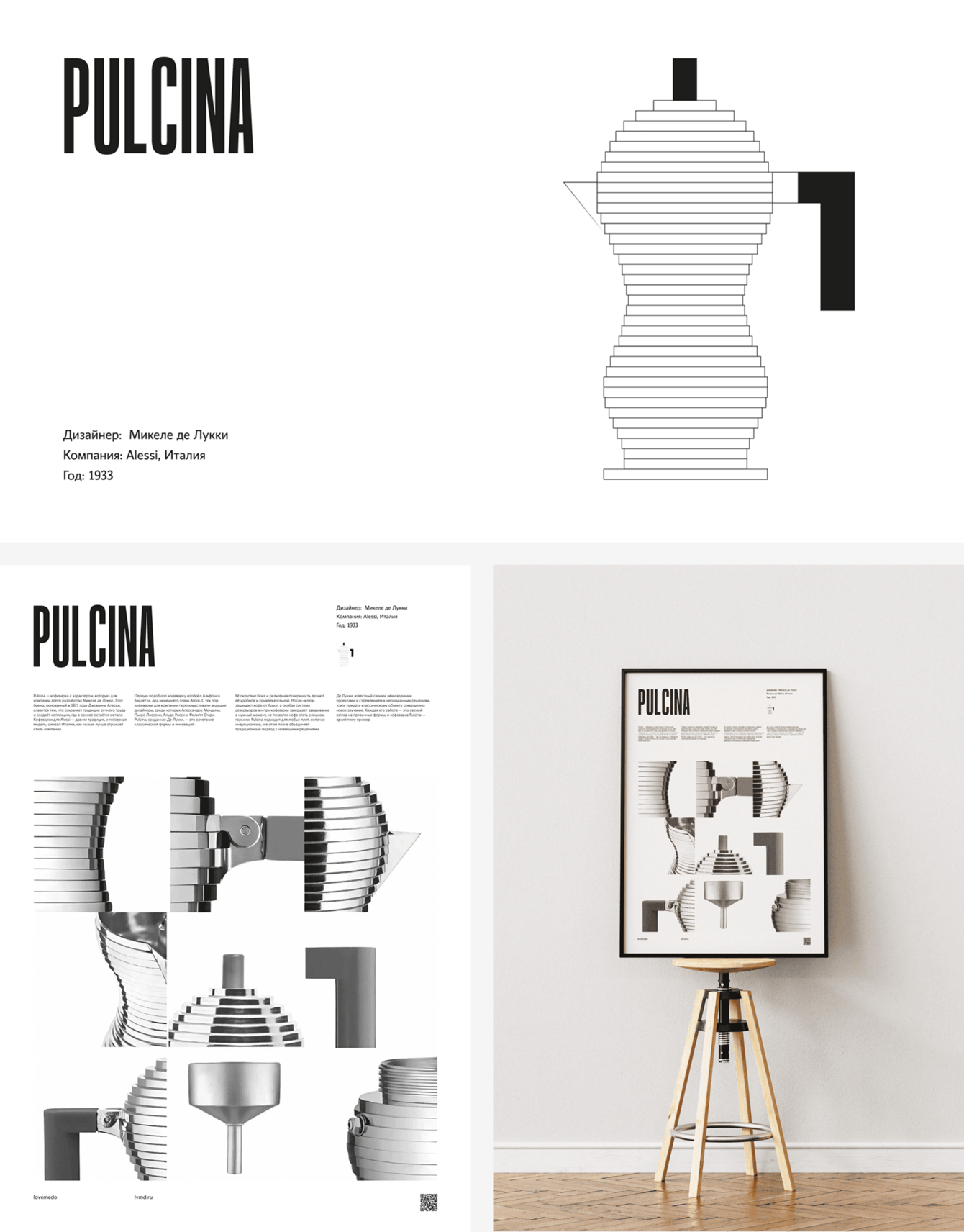 Первую подобную кофеварку изобрёл Альфонсо Биалетти, дед нынешнего главы Alessi. С тех пор кофеварки для компании переосмысливали ведущие дизайнеры, среди которых Алессандро Мендини, Пьеро Лиссони, Альдо Росси и Филипп Старк. Pulcina, созданная-Де Лукки, — это сочетание классической формы и инноваций.