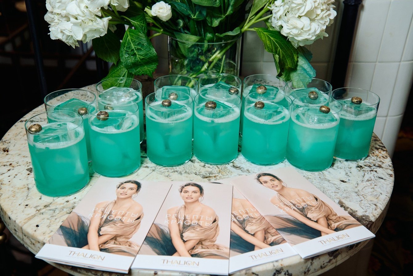 Шеф-бармен Егор Бочаров и специалисты THALION объединили свои знания и создали фирменный безалкогольный коктейль “Сердце Океана”, который своим цветом напоминает лазурные воды чистейшего моря Ируаз, родины и источника ингредиентов для всех средств THALION. В составе коктейля Heart of the Ocean безалкогольный джин, груша, корица, имбирный эль. Золотая жемчужина из ягоды голубики венчает освежающий коктейль.