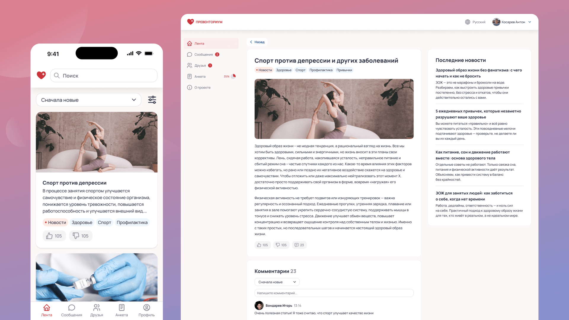Клиенту нужна была единая платформа, где можно публиковать полезные материалы о здоровье и проводить опросы для медицинских исследований. Важные требования: быстрый конструктор анкет, удобное заполнение с мобильных, базовые социальные функции (друзья, сообщения, реакции), поиск по тегам и понятная модерация контента. Цель – собрать качественные ответы и вовлечь сообщество вокруг темы ЗОЖ.