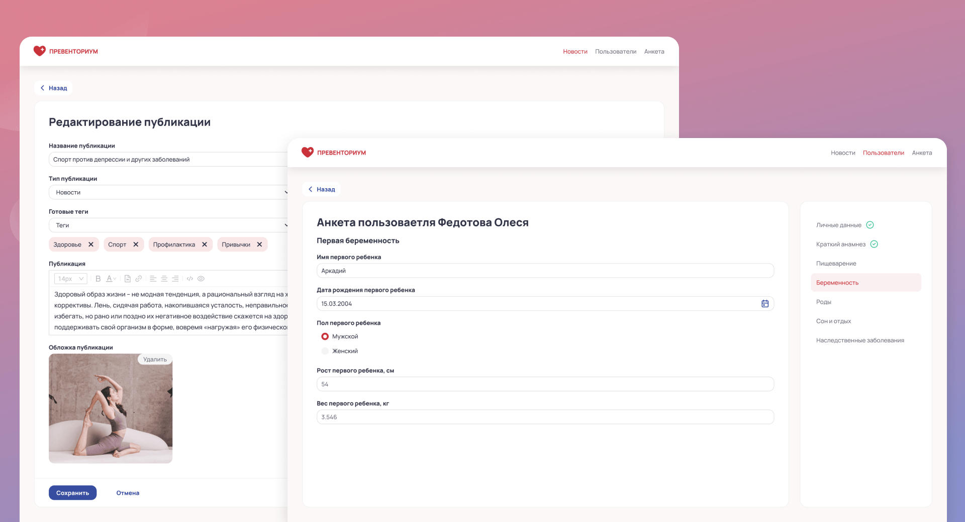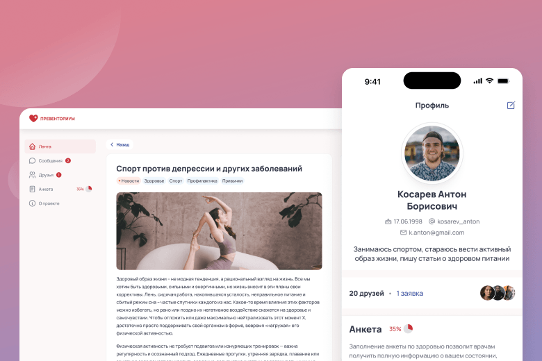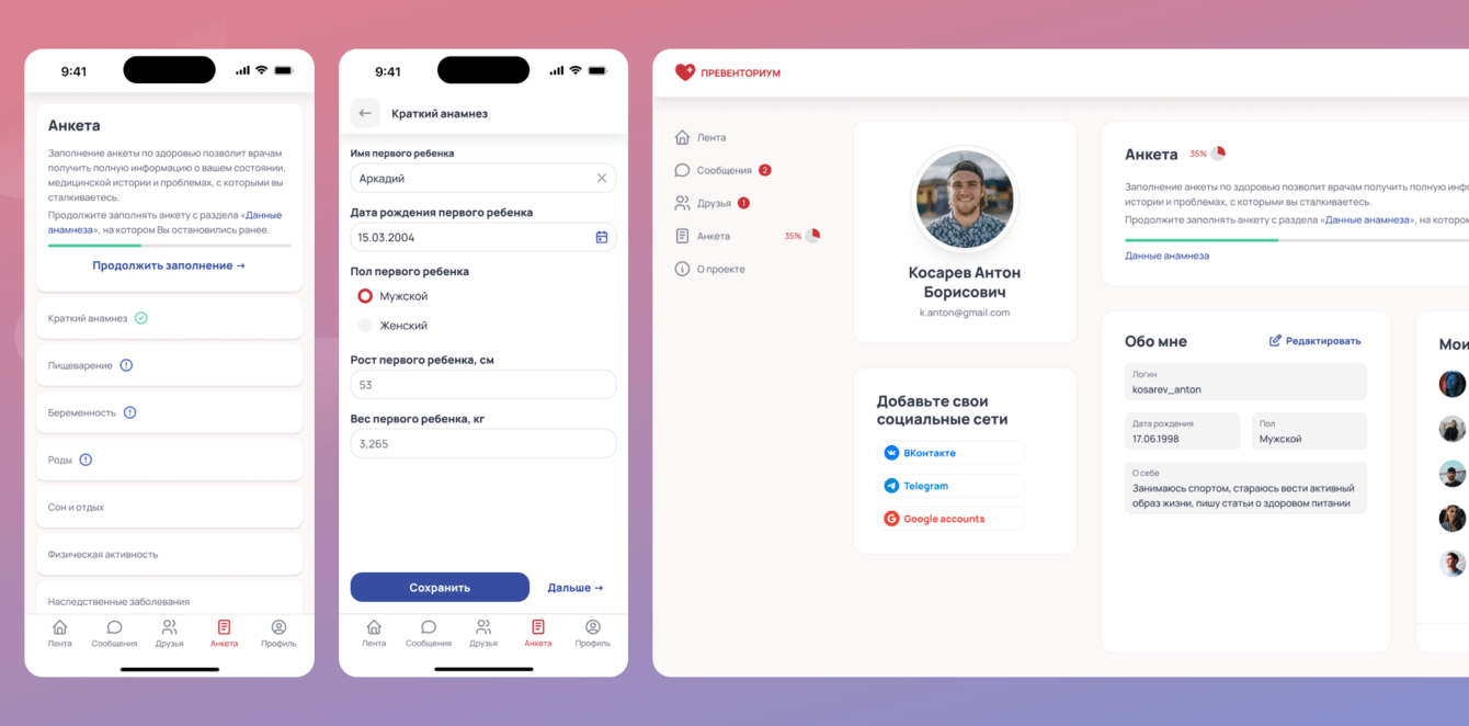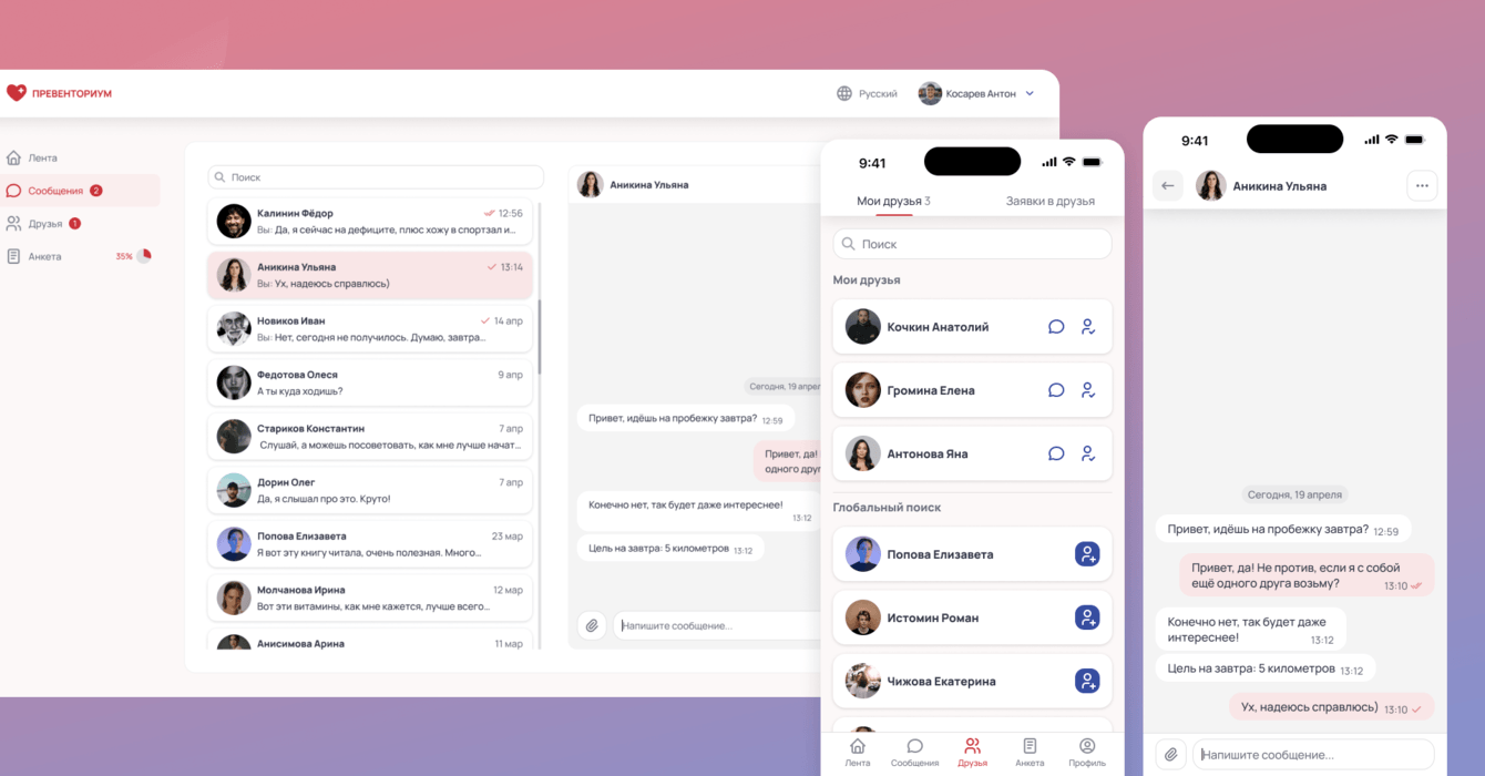 Передали заказчику рабочий MVP «Превенториум»: веб-клиент, нативные приложения (Android/iOS), админ-панель и REST-бэкенд.