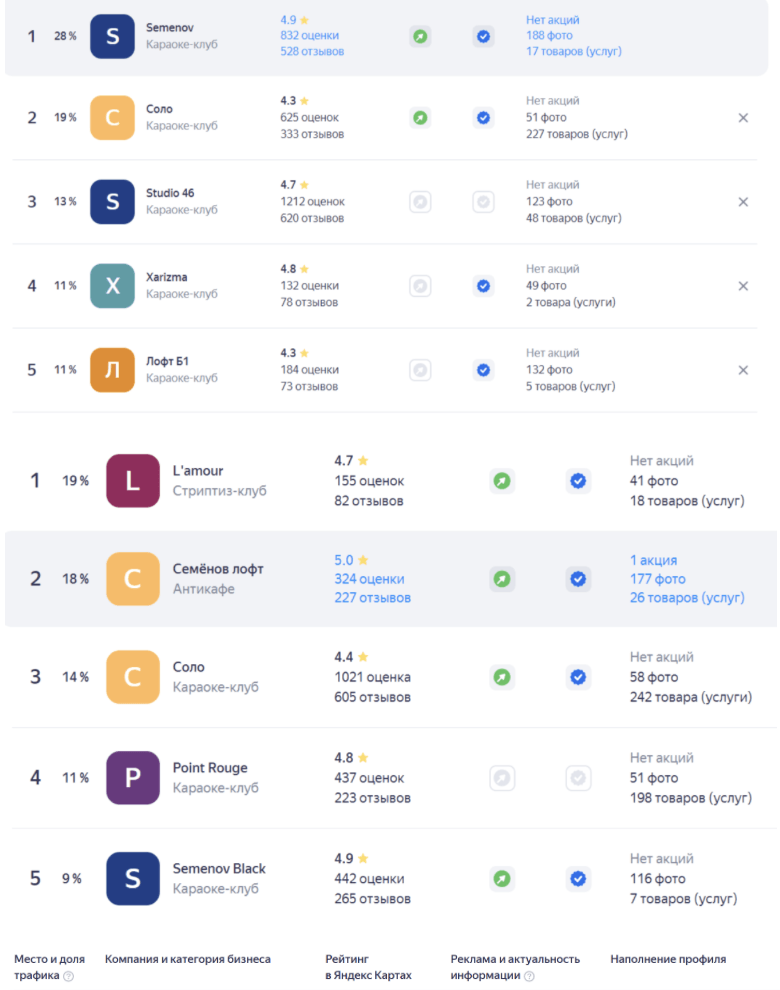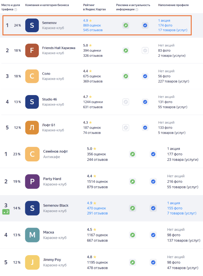 По еженедельной статистике филиалы SEMENOV стабильно занимают первые позиции в результатах поиска на Яндекс.Картах, что свидетельствует о высоком уровне видимости и привлекательности для пользователей.
