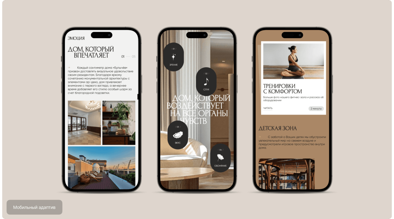 Дом бутик-класса «Булычёв» позиционирует себя как дом, который воздействует на все органы чувств. В отдельном большом блоке нам предстояло передать эмоции за счёт функций дома и постепенно подвести пользователя к блоку с квартирами и планировками.