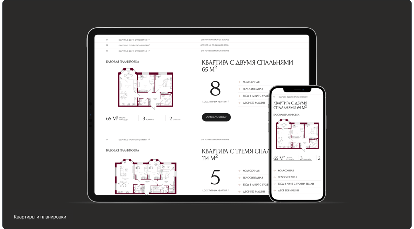 Сайт предоставляет всю необходимую информацию о комплексе, возможность выбрать подходящую планировку квартиры и записаться на просмотр.