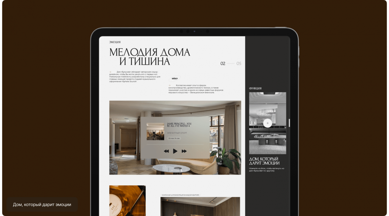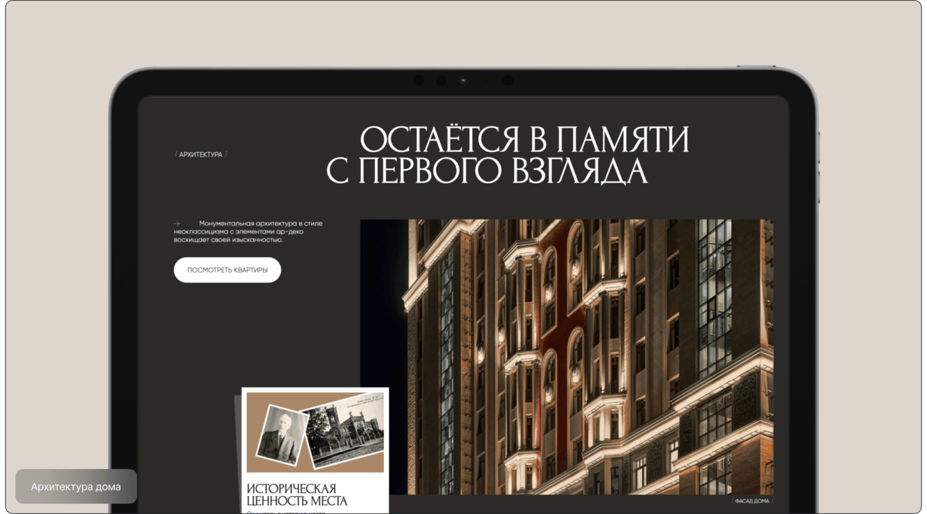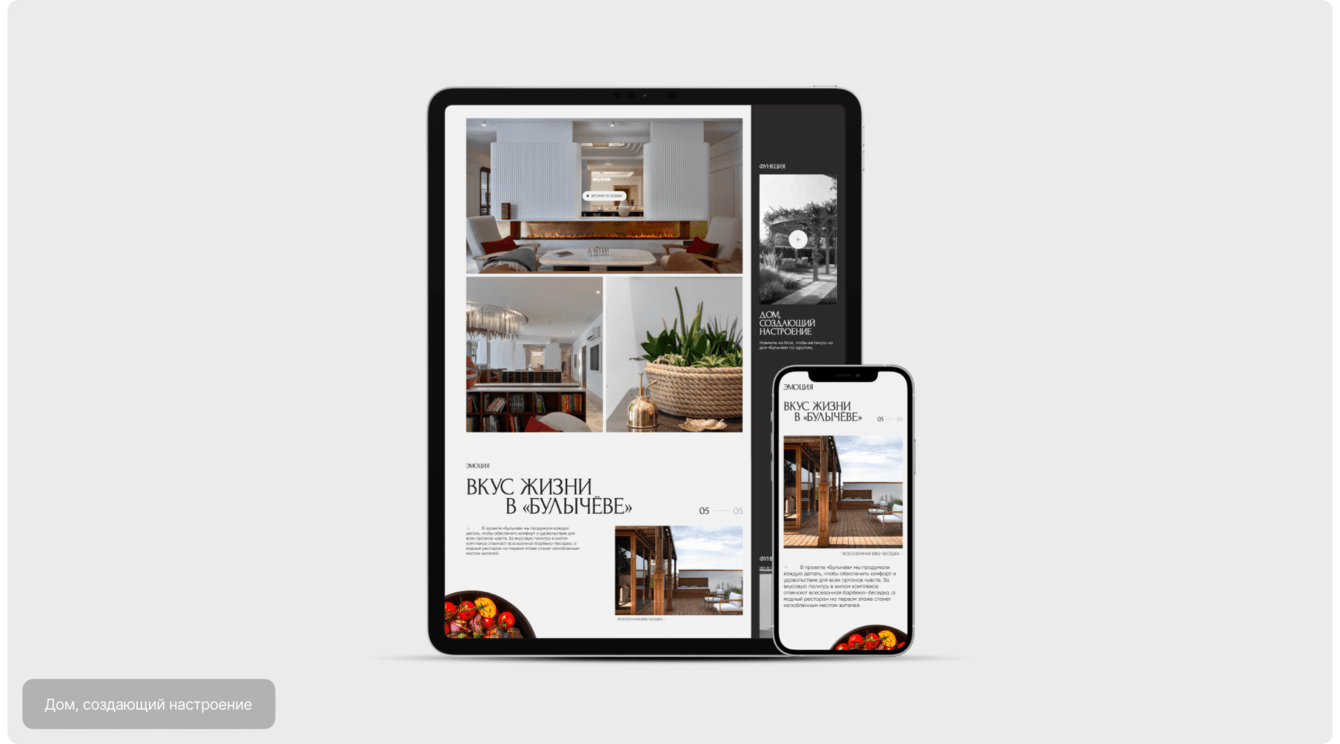 В результате мы разработали и запустили презентационный лендинг для дома бутик-класса «Булычёв» с интересными дизайнерскими решениями. Сайт раскрывает позиционирование, преимущества ЖК, подчёркивает премиальность и эксклюзивность дома, а также позволяет погрузиться в детали и атмосферу проекта.