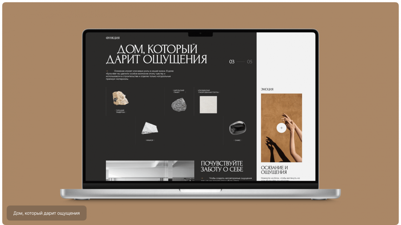 Мы зафиксировали изображение — функцию справа, а контент слева движется привычным скроллом. По клику на изображение пользователь переходит к эмоции. Благодаря дополнительным эффектам получилось передать атмосферу дома, вызвать ассоциации и создать ощущение присутствия.
