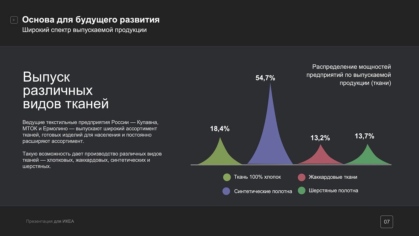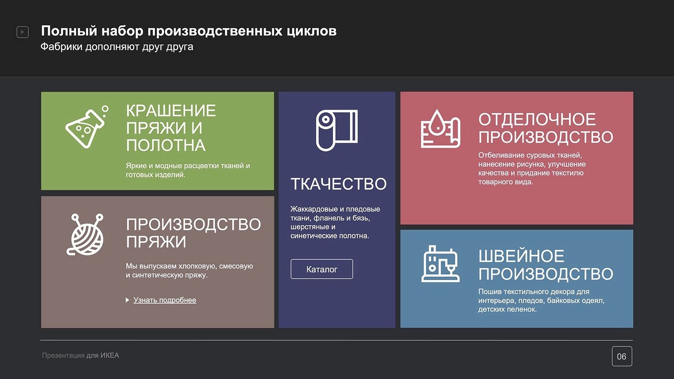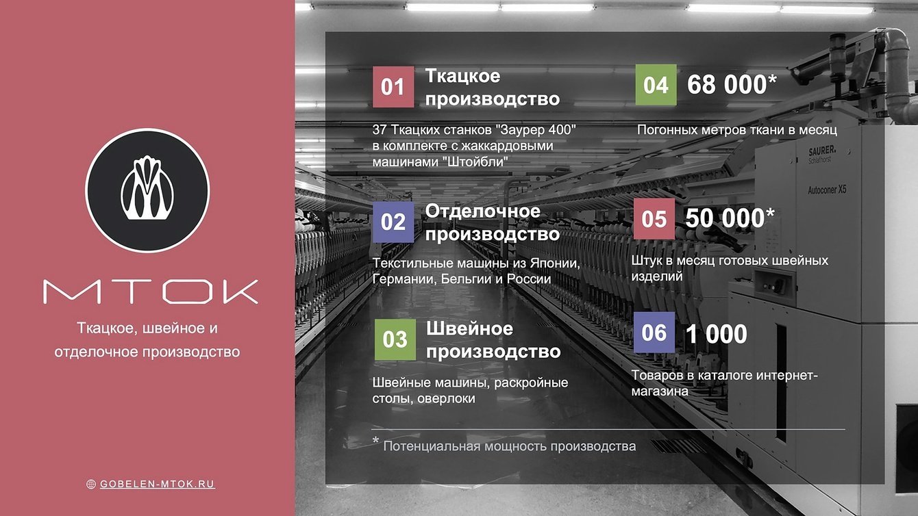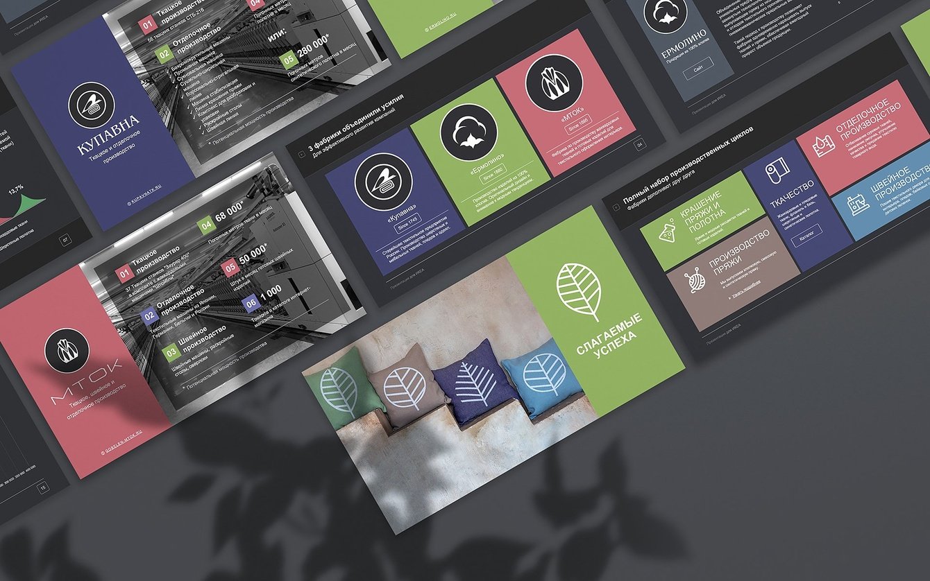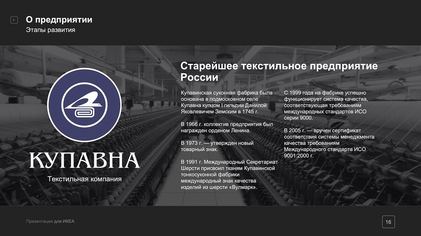 Слегка приглушенный черно-белый фон слайдов в разработанной нами Презентации PowerPoint дает едва уловимую винтажную нотку, которая отражает богатую историю текстильных предприятий холдинга.