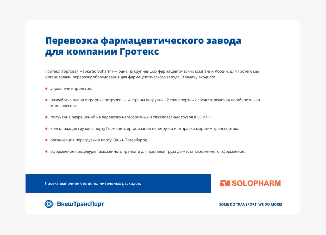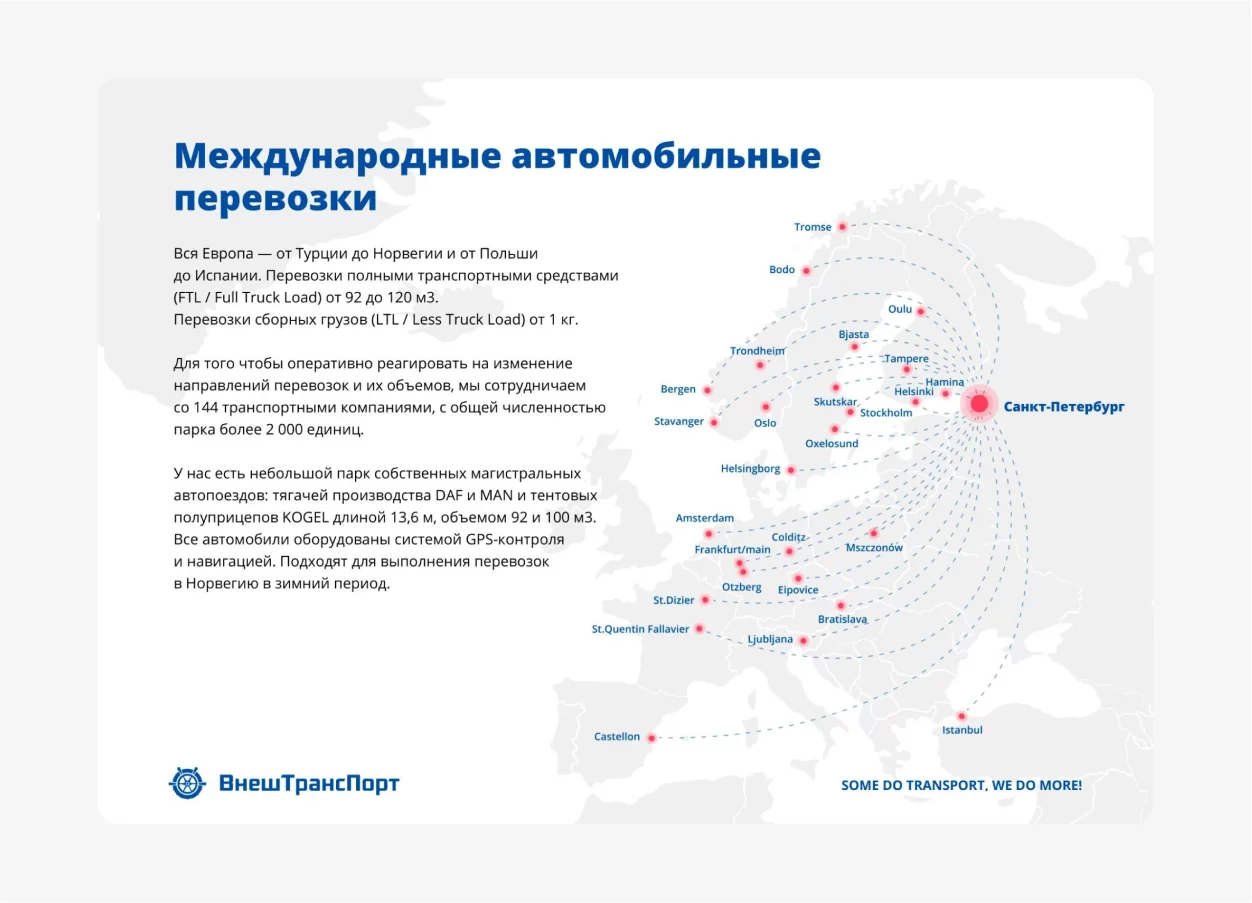 Так как компания клиента получала заказы в основном по сарафанному радио, а в интернете информации о ней почти не было, мы не могли с ходу погрузиться в работу. Чтобы набрать достаточно материала на презентацию, мы провели интервью с генеральным директором: выяснили цели и задачи ВнешТрансПорта, узнали о преимуществах, собрали примеры работы.
