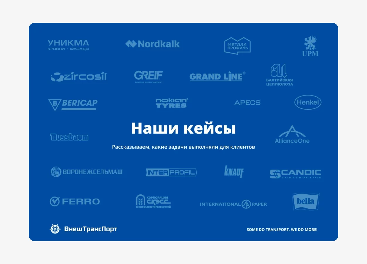 Чтобы привлечь клиентов презентацией, мы решили показать внутри опыт работы ВнешТрансПорта. Для этого на интервью с генеральным директором собрали примеры работы, а также разместили на слайде логотипы ключевых клиентов.