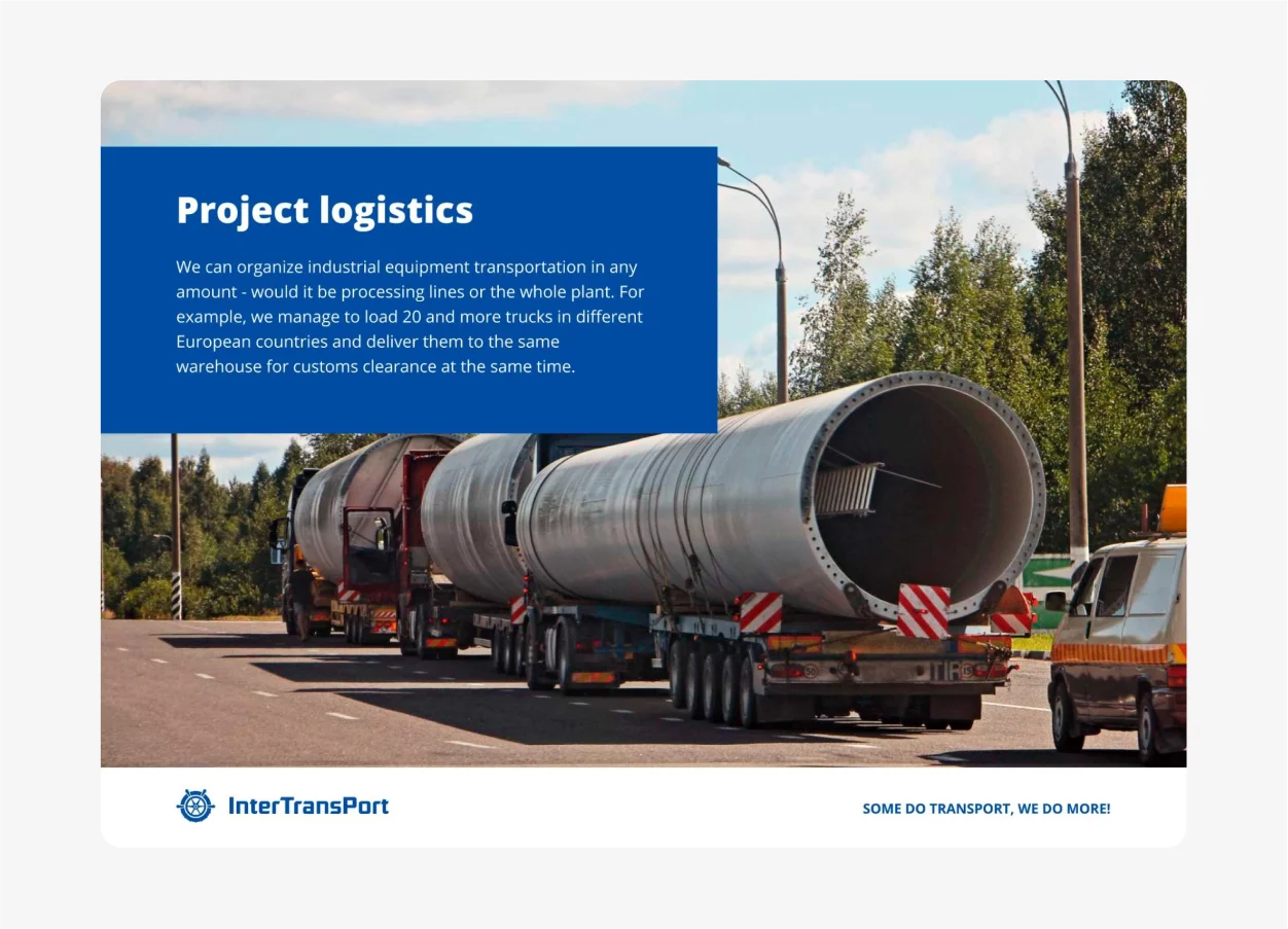 Чтобы найти баланс, мы по многу раз согласовывали с генеральным директором текст, пока не добились нужного результата. Когда текст устроил нас всех, клиент провел тест: попросил партнеров из сферы логистики посмотреть презентацию и высказать свое мнение. По итогу получили от партнеров положительную рецензию.