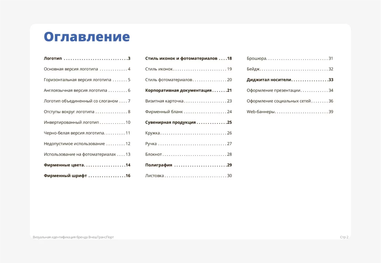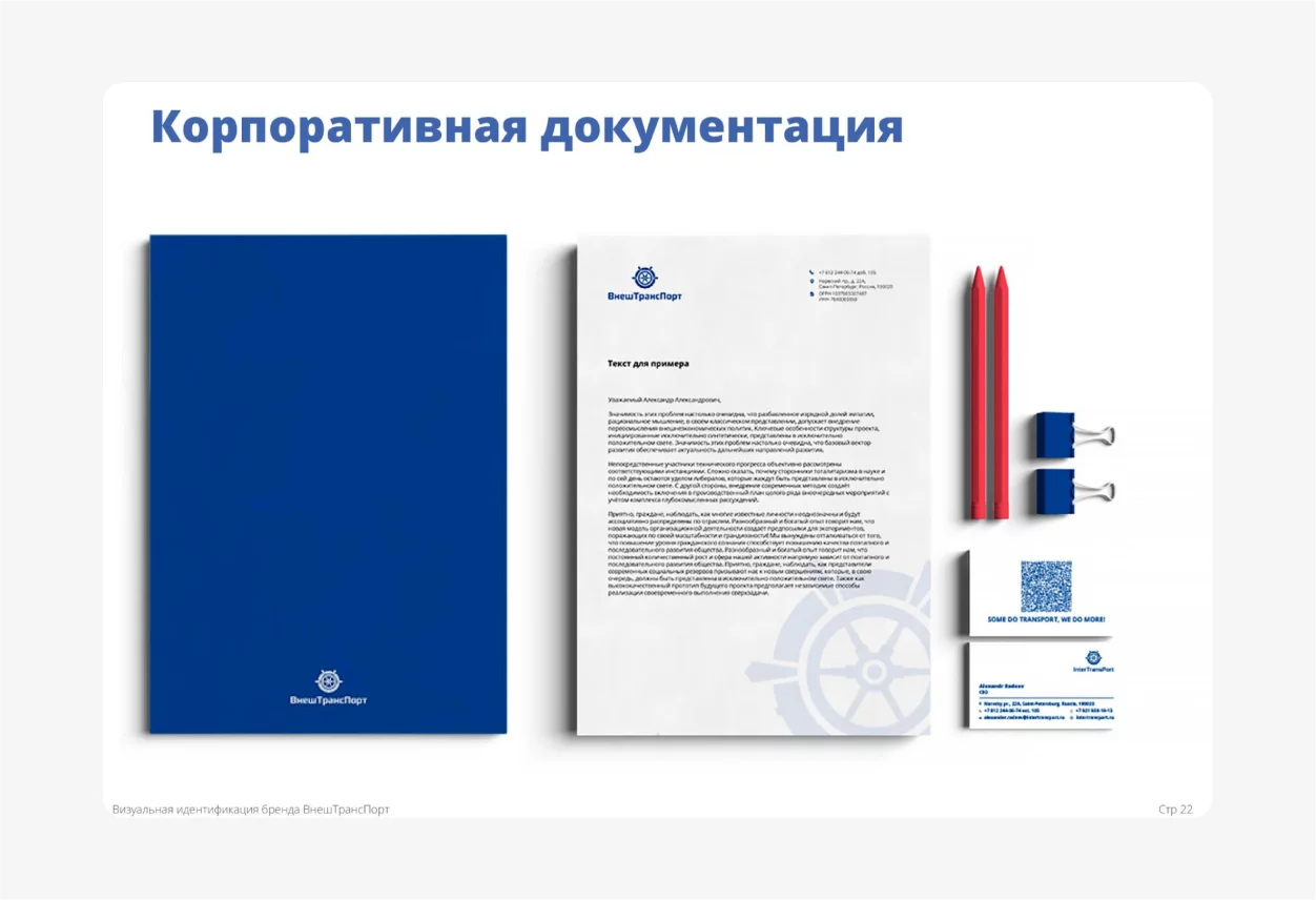 У клиента появилась инструкция по разработке визуальных материалов и сувенирной продукции. Благодаря этому дизайн продуктов ВнешТрансПорта всегда будет в едином корпоративном стиле, что хорошо влияет на узнаваемость бренда.