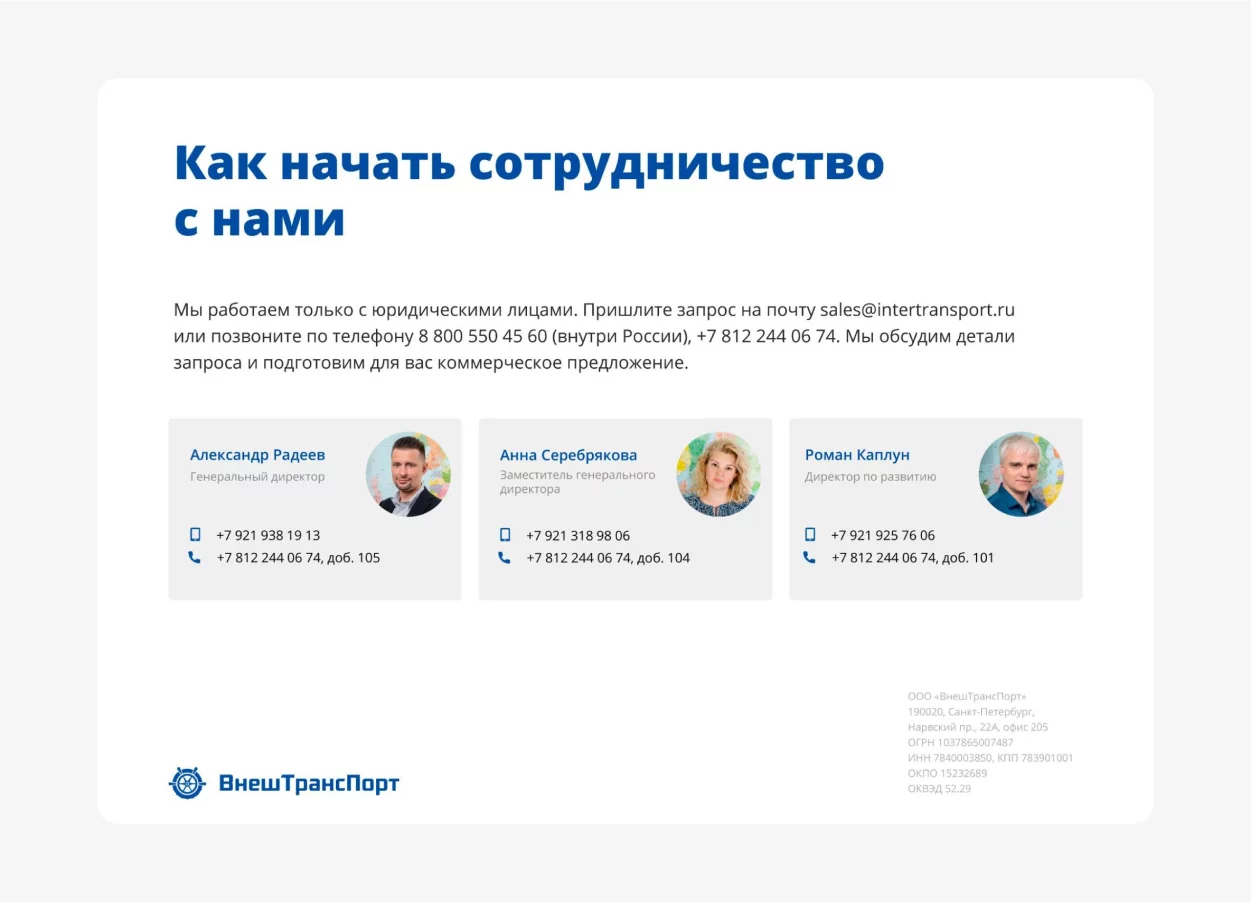 1. Сделать презентацию о компании. Ее можно будет пересылать клиентам, чтобы разгрузить кол-центр. До этого ВнешТрансПорту приходилось рассказывать о своей компании либо по телефону, либо текстом по имейлу.