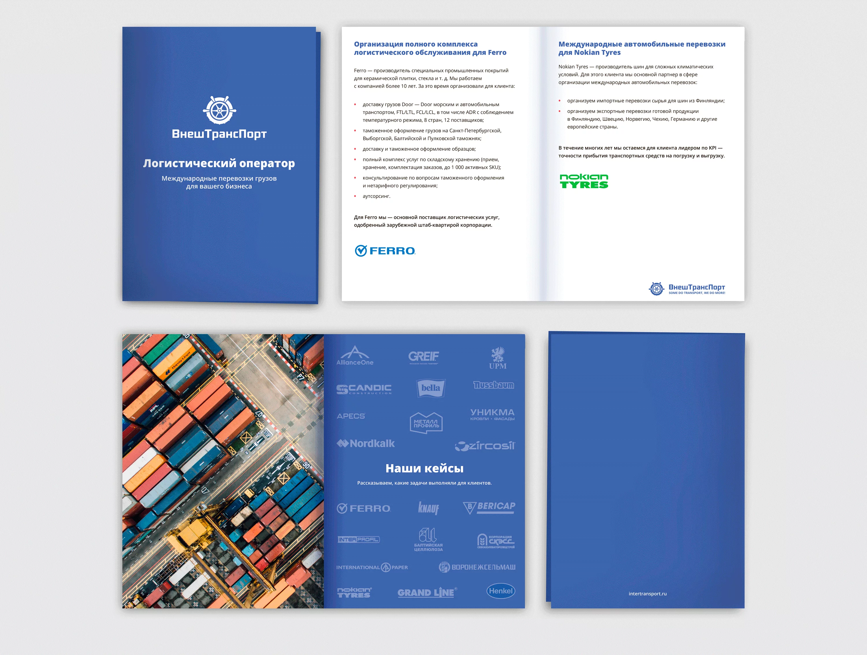 ВнешТрансПорт часто участвует в бизнес-встречах. Чтобы привлечь новых клиентов на таких мероприятиях, планировали раздавать им брошюры с описанием услуг и преимуществ. Брошюра работает на привлечение клиентов и после встречи: ее можно забрать домой и изучить позже.
