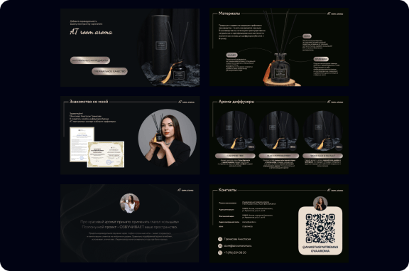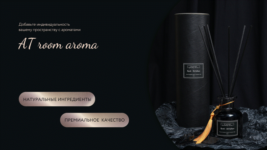 Создать стильную и информативную презентацию для бренда арома-диффузоров AT Room Aroma, которая будет использоваться в качестве коммерческого предложения для потенциальных заказчиков.