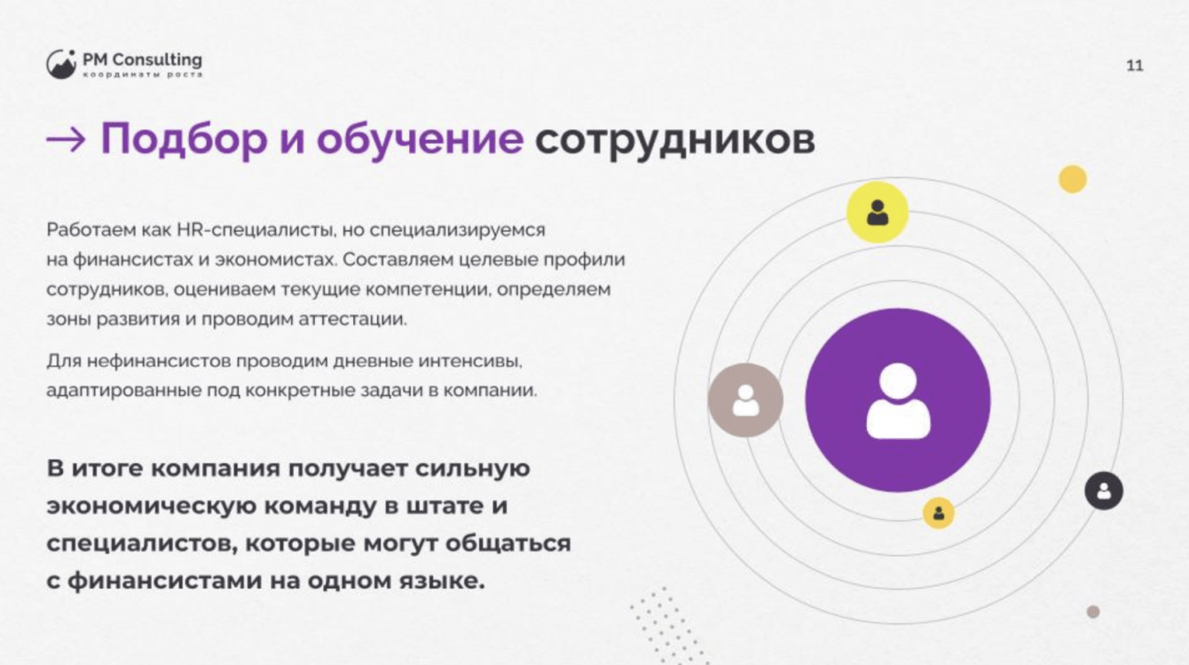 Чтобы сделать 20 убедительных слайдов о работе компании, нам потребовалось глубоко погрузиться в услуги компании. Для этого мы провели серию интервью, на которых обсуждали каждое направление деятельности отдельно.