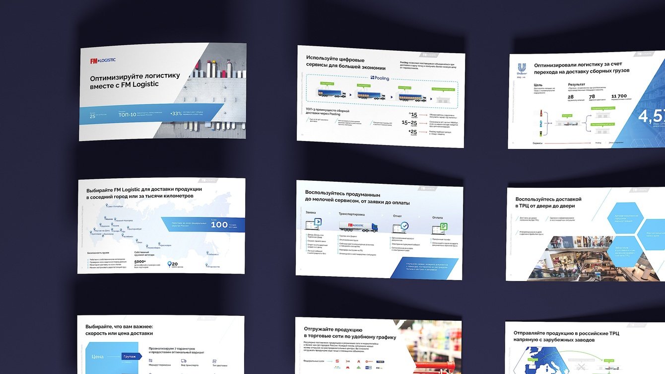 FM Logistic — компания с большим количеством клиентов из разных сфер. Менеджеры по работе с клиентами не могли пользоваться единой презентацией, потому что она была слишком общей и не раскрывала специфики направлений. В то же время презентация с подробным описанием всех процессов компании была слишком громоздкой и перегружала клиентов. Нужно было найти решение для работы с клиентами.