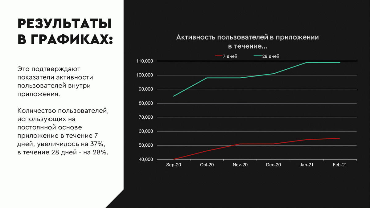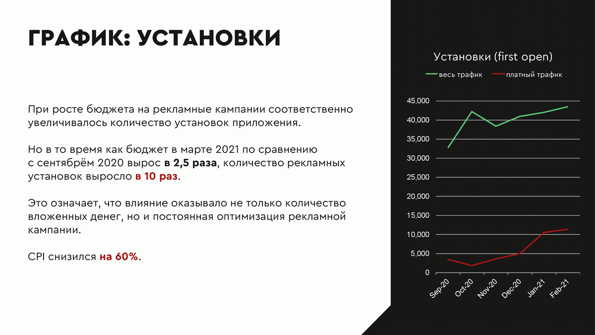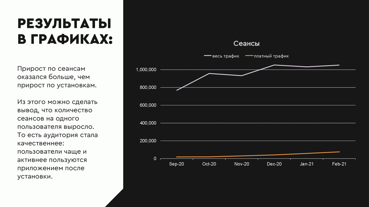 Количество установок выросло с 1016 в августе 2020 года до 11675 в феврале 2021 года. Количество установок за весь период – 35 832. Но в то время как бюджет в марте 2021 по сравнению с сентябрём 2020 вырос в 2,5 раза, количество рекламных установок выросло в 10 раз. Это означает, что влияние оказывало не только количество вложенных денег, но и постоянная оптимизация рекламной кампании. Прирост по сеансам оказался больше, чем прирост по установкам. Из этого можно сделать вывод, что количество сеансов на одного пользователя выросло. То есть аудитория стала качественнее: пользователи чаще и активнее пользуются приложением после установки.