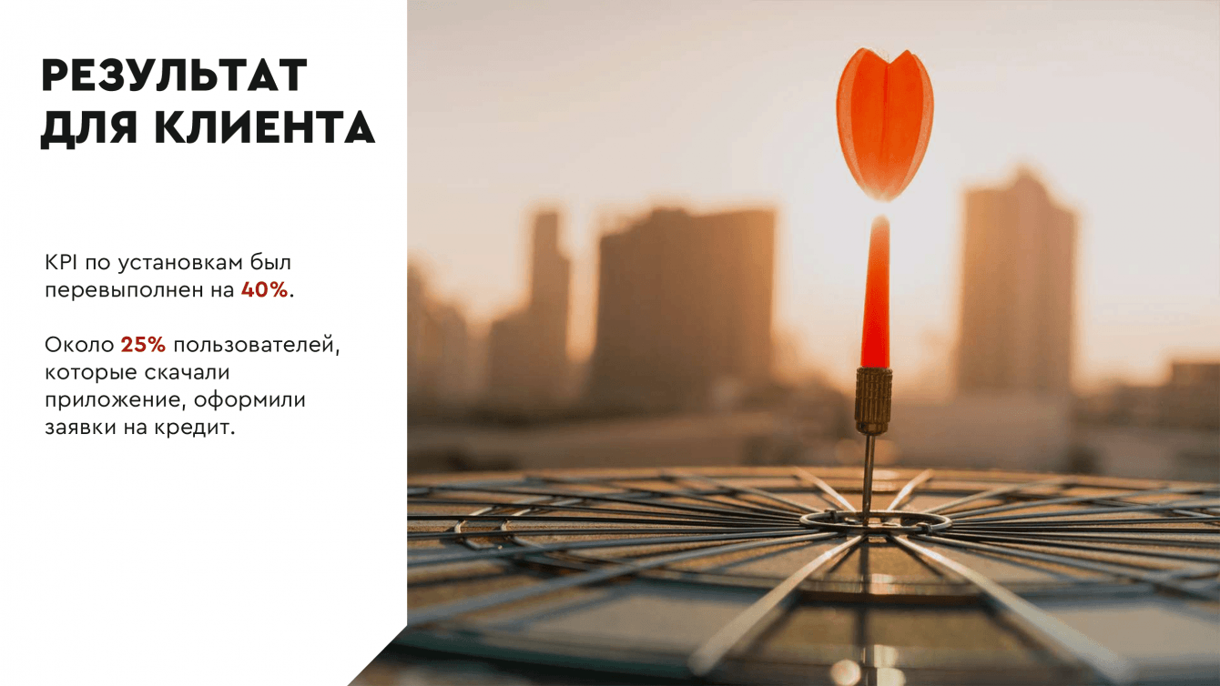 Увеличить количество заявок на онлай-кредит благодаря продвижению мобильного приложения банка. Обеспечить 25 721,00 установок за 5 месяцев.