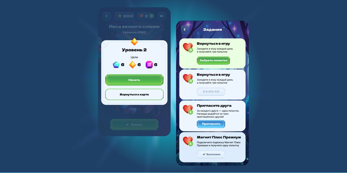 - списание бонусов программы лояльности: игроки могут использовать бонусы «М+» для покупки жизней, бустеров и дополнительных ходов; усилило связку между офлайн-покупками и игровым процессом, превратив бонусную валюту в часть гейминга;