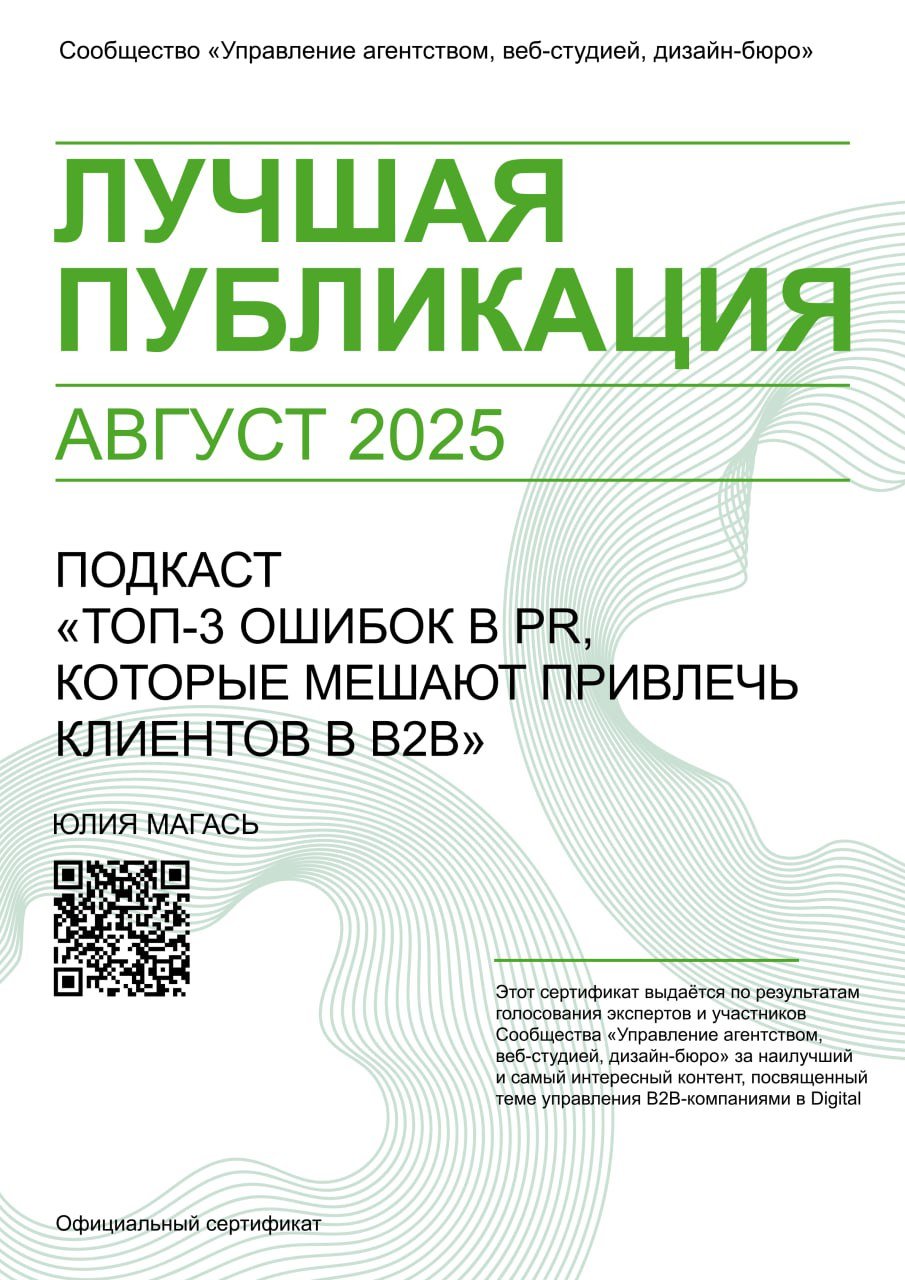 Кроме того один из выпусков подкаста получил награду "Лучшая публикация месяца" в августе 2025 г. в рамках профессионального сообщества "Управление агентством" https://t.me/agencymanagement/3517