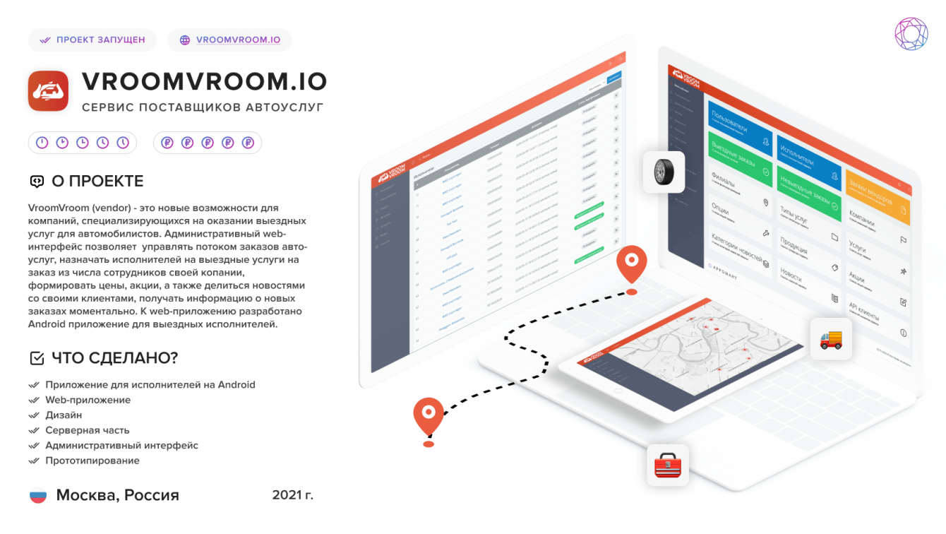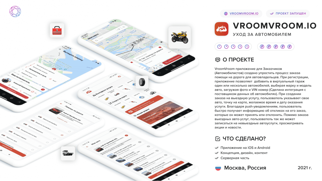 Мы разработали инновационный IT-проект, VroomVroom, с целью радикального изменения способа заказа автомобильной помощи для автовладельцев. С помощью приложения пользователи могут зарегистрироваться и добавить один или несколько автомобилей в свой виртуальный гараж, выбрав конкретную модель, загрузив фотографии и интегрировавшись с провайдером данных автомобилей через VIN. Создавая заказ на мобильную услугу, пользователь может указать автомобиль, местоположение, дату и время обслуживания и получать push-уведомления о ответах контракторов. Кроме того, пользователи могут зарегистрироваться на стационарные автомобильные услуги и просматривать промо-акции компании и новости, связанные с автомобилями.