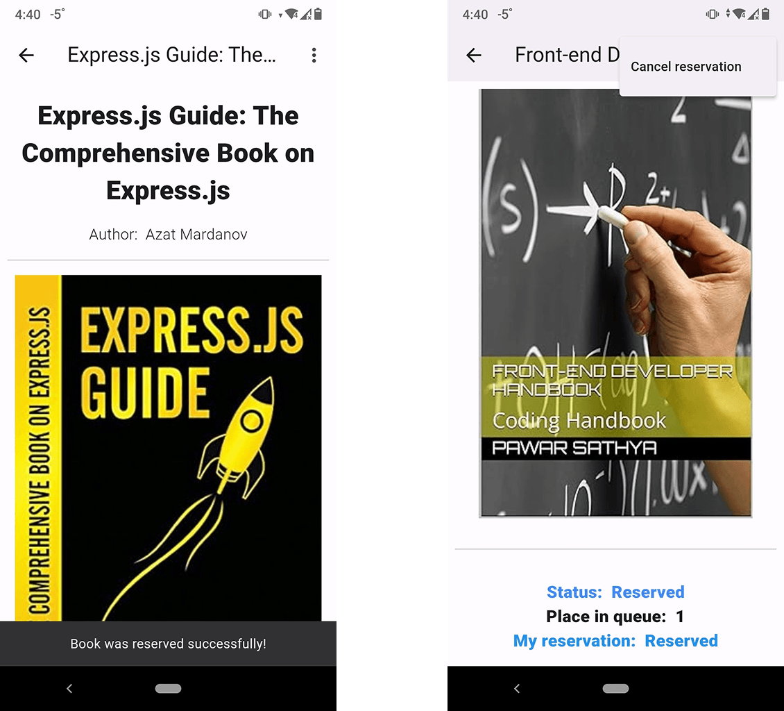 Было разработано удобное мобильное приложение для управления учетными записями читателей в библиотеке. Приложение позволяет пользователям просматривать и искать книги, резервировать их, отслеживать взятые книги и возвращать их в библиотеку. Пользователи также могут управлять своим бронированием и получать уведомления, когда зарезервированная книга становится доступной.