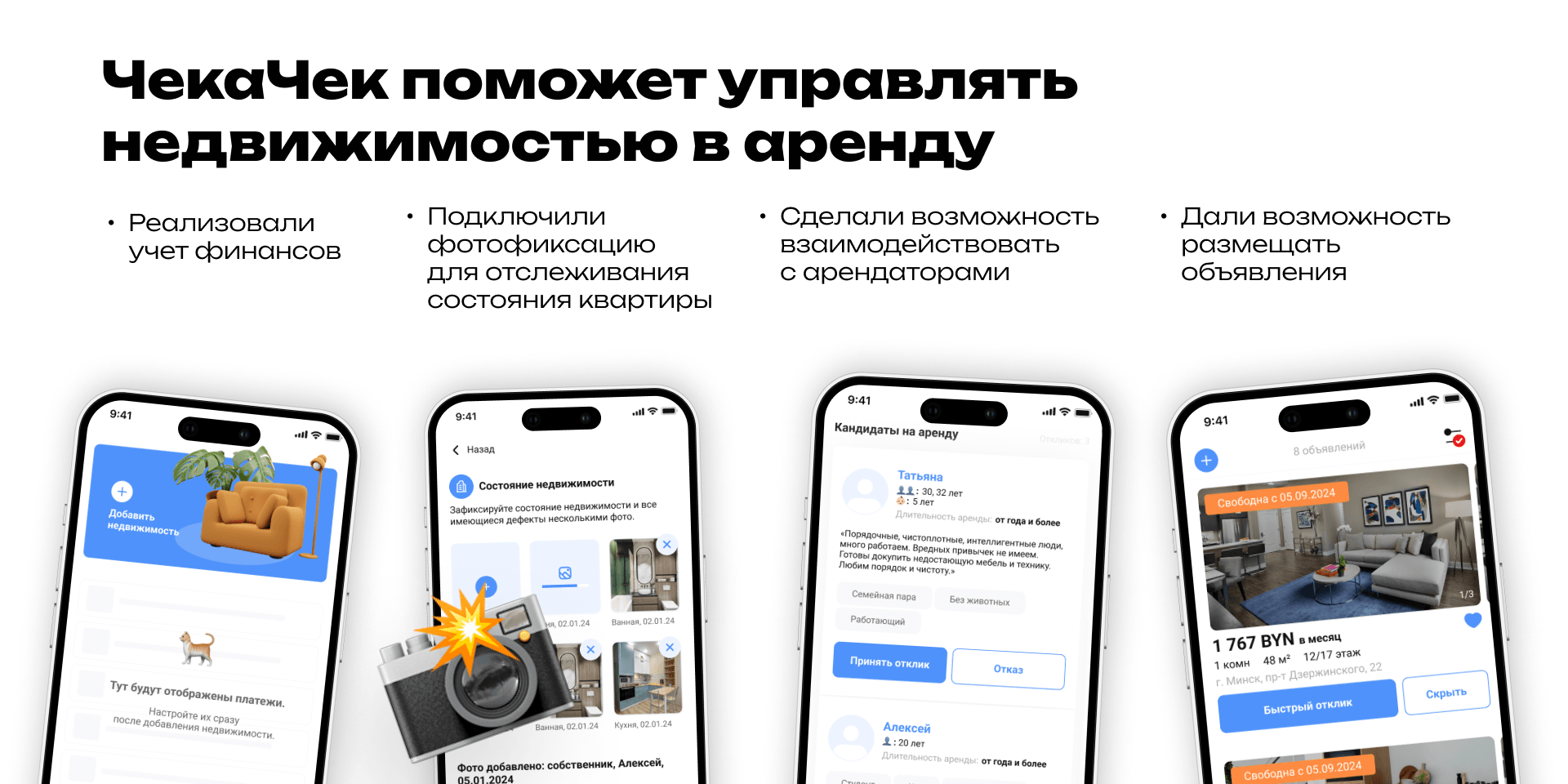 - История состояния недвижимости. Приложение позволяет фиксировать на фотографиях и вести историю состояния объекта недвижимости в процессе аренды, чтобы иметь визуальный учет состояния объекта.