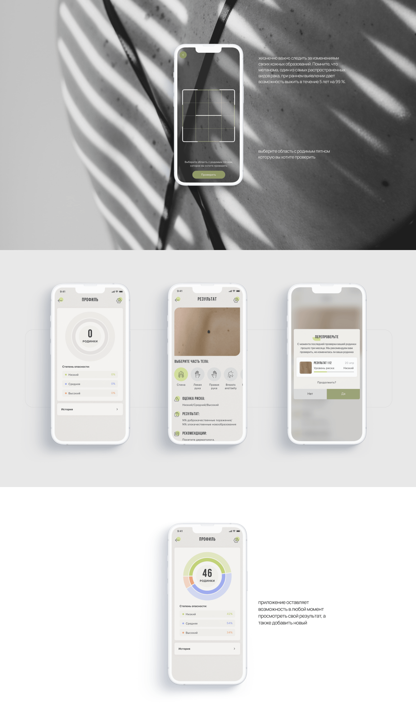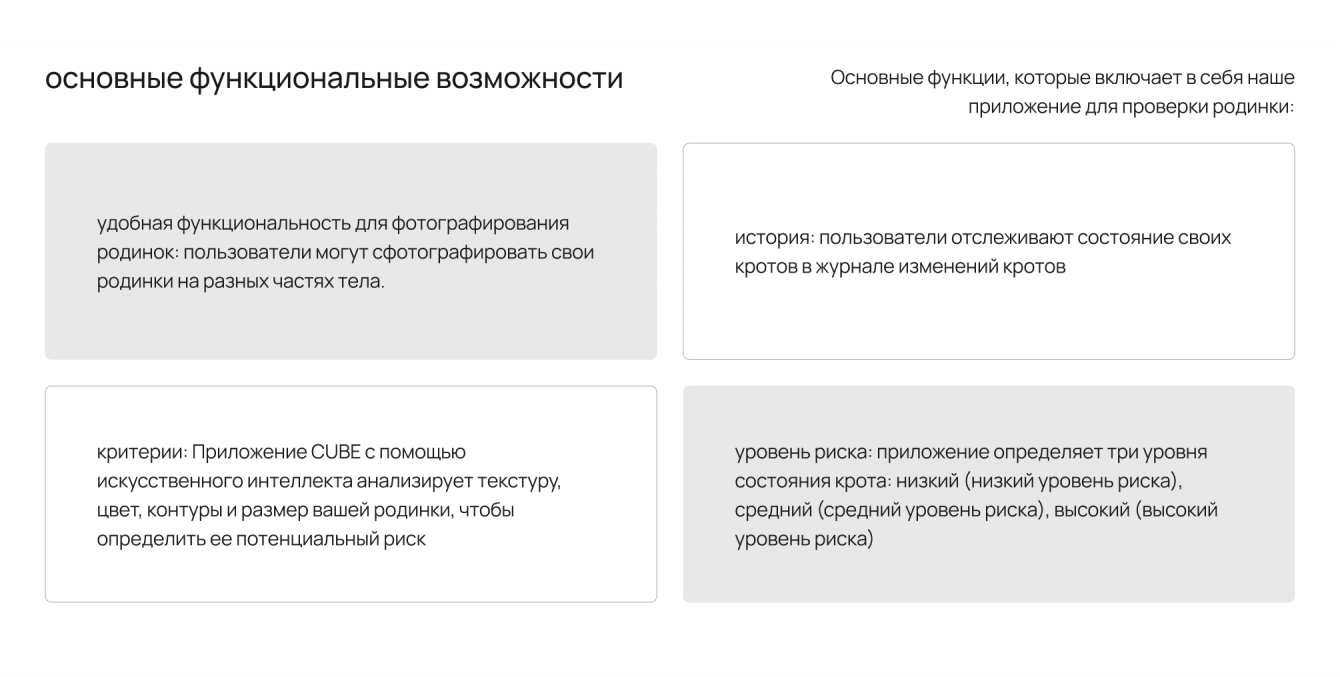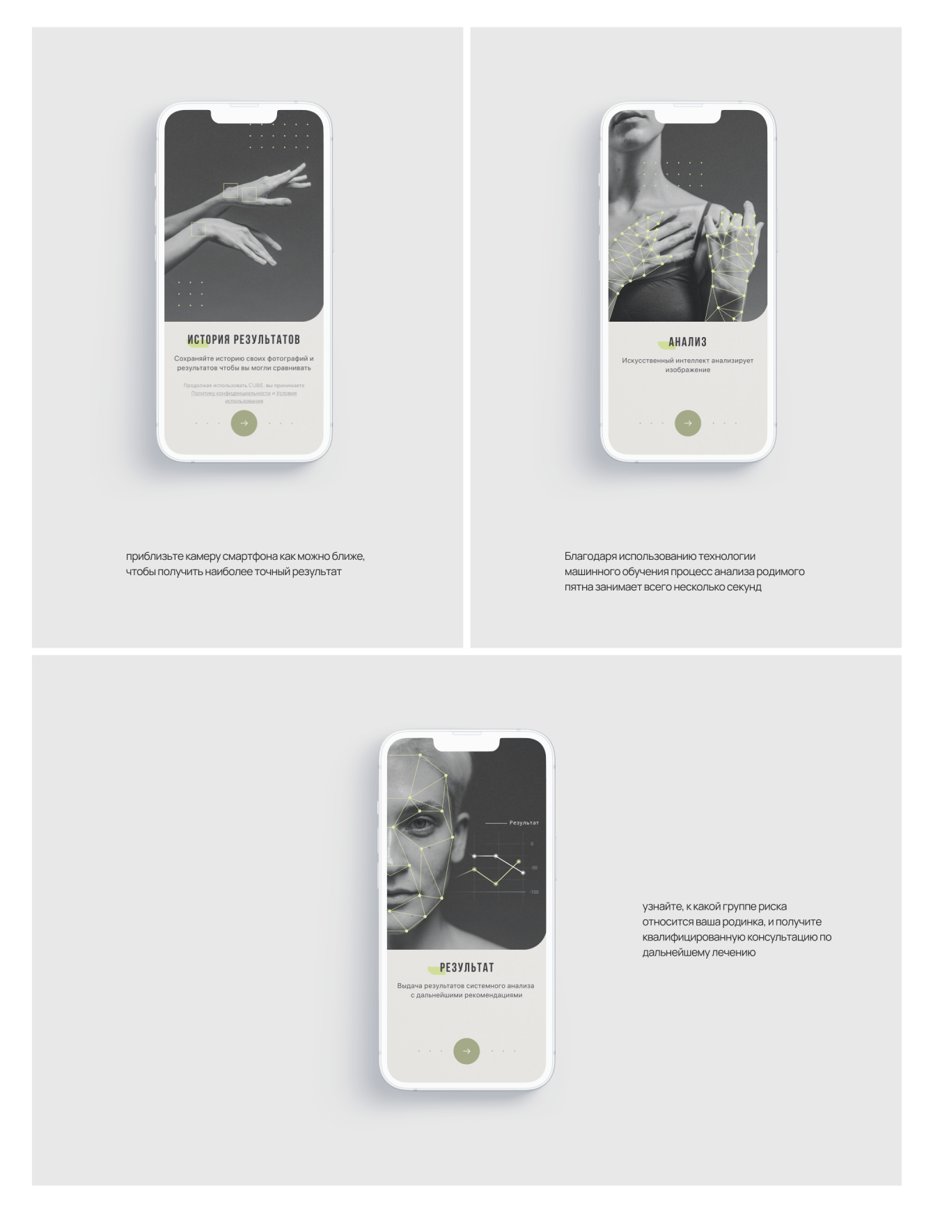 Требовалось разработать мобильное приложение, которое позволит пользователям легко и удобно проводить проверку родимых пятен. Основной функционал приложения должен включать в себя возможность сделать фотографию родимого пятна, после чего алгоритм искусственного интеллекта должен автоматически анализировать изображение и определять особенности пятна, а также отслеживать любые изменения в его размере, форме или цвете. Пользователям также должна быть предоставлена возможность просматривать статистику изменений родимых пятен во времени и получать рекомендации относительно необходимости обращения к врачу. Приложение должно быть интуитивно понятным, легким в использовании и обеспечивать конфиденциальность пользовательских данных. Требовалось высокое качество распознавания и анализа родимых пятен с минимальным количеством ложных срабатываний.
