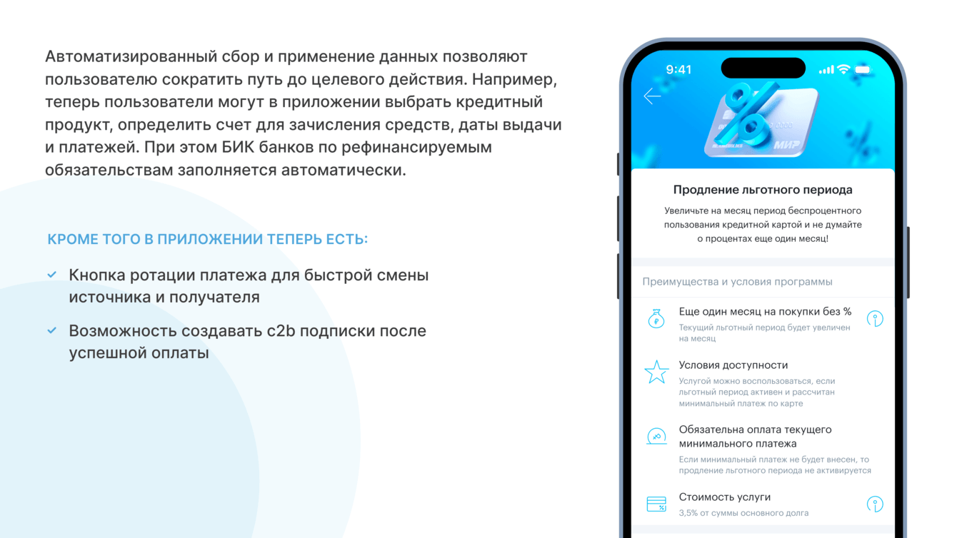 - для клиентов продукта “кредитные карта” появилась возможность, продлевать льготный период, пропускать платеж, оформить подписку на снятие наличных