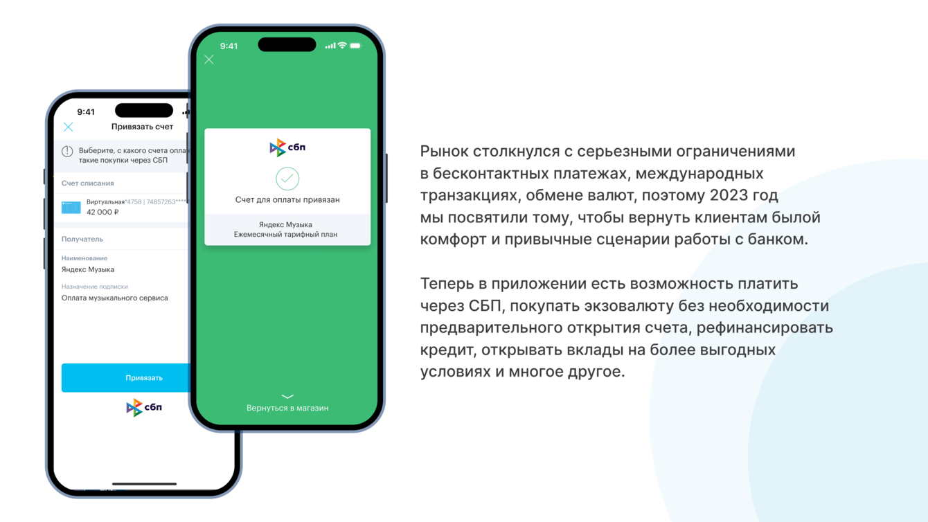 В прошлом году рынок столкнулся с серьезными ограничениями в бесконтактных платежах, международных транзакциях, обмене валют. Банк посвятил 2023 год тому, чтобы вернуть клиентам былой комфорт и привычные сценарии работы с банком.