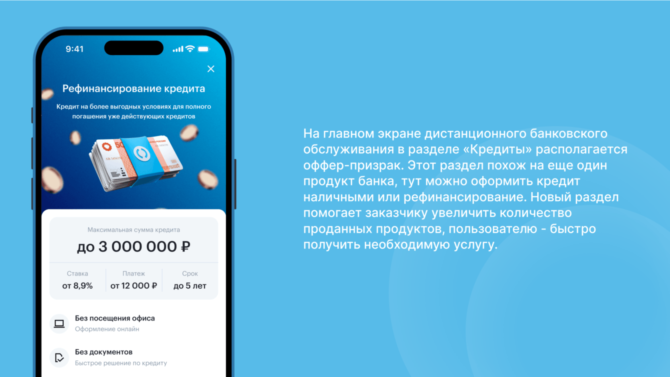 - возможность бесшовного перехода с заявки на сайте для продолжения оформления и выдачи кредита наличными в МБ