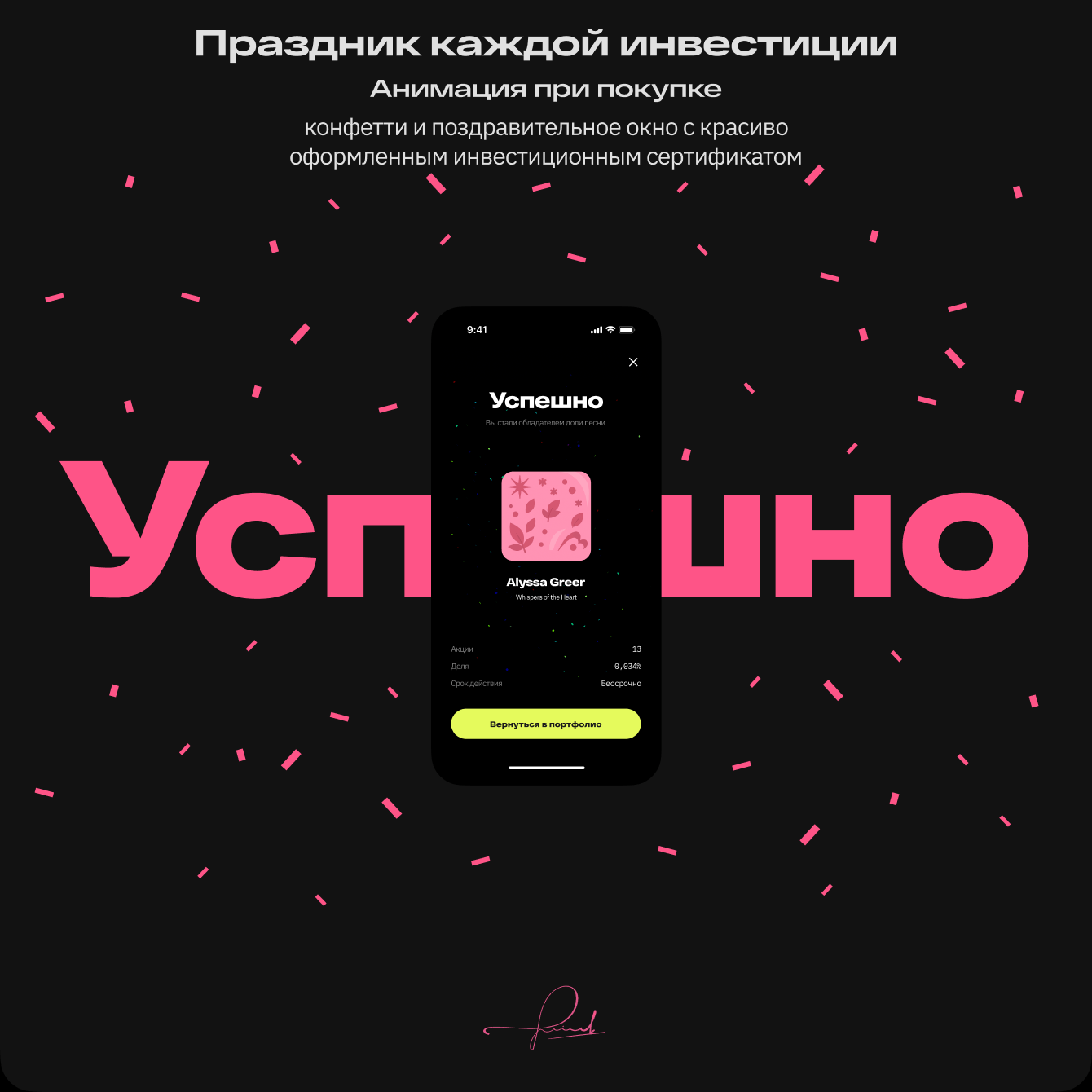 Чтобы процесс инвестирования был увлекательным, мы добавили геймификацию: интерактивный бегунок и анимацию при покупке.