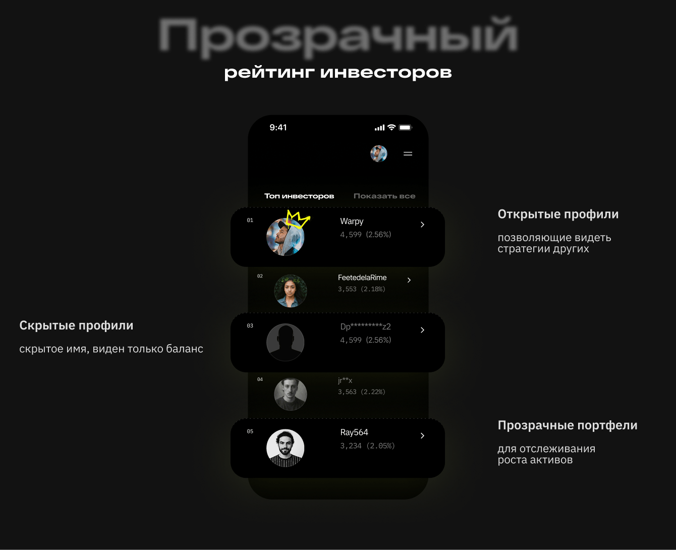 Инвесторы могут видеть профили друг друга, отслеживать портфели и изучать статистику. Это делает процесс более прозрачным и вовлекающим.