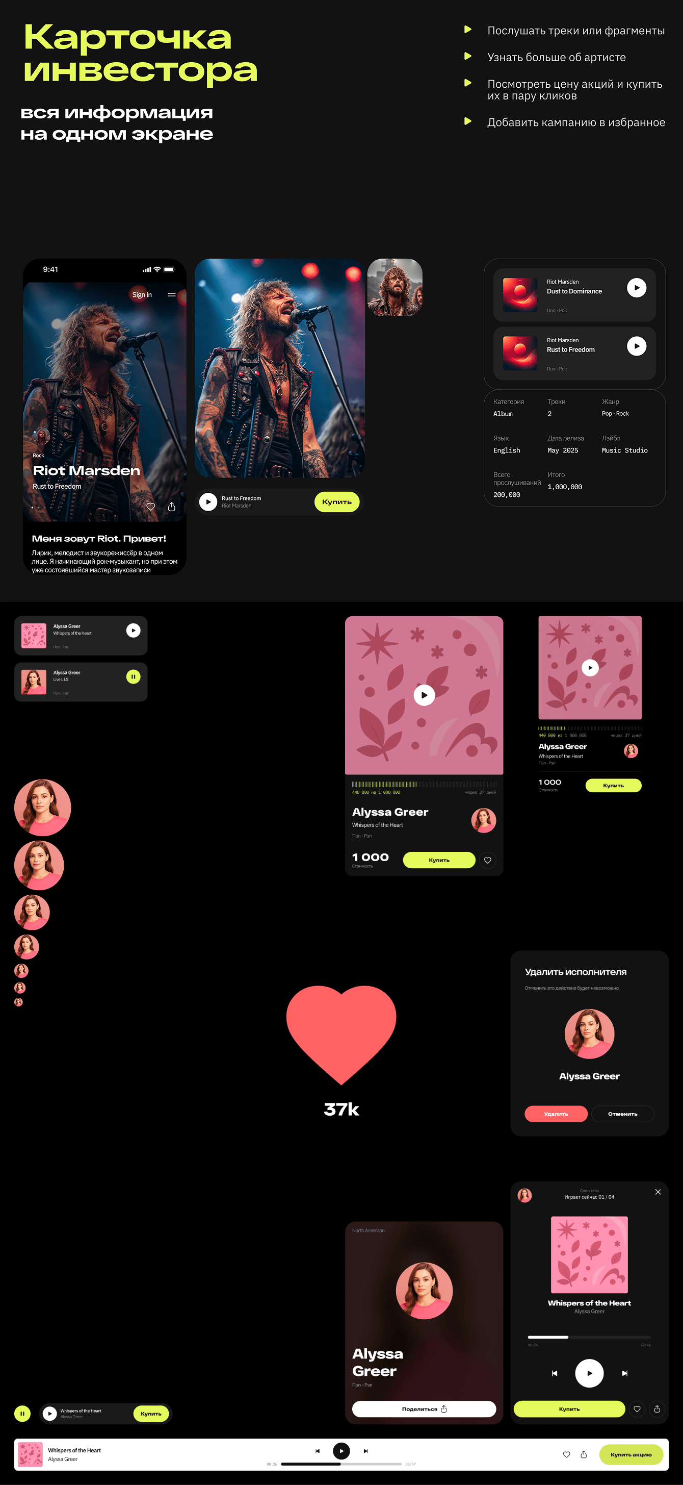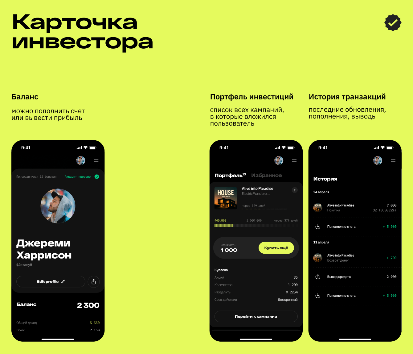 • Сделать взаимодействие с платформой интуитивно понятным для обеих категорий пользователей – инвесторов и представителей музыкальной индустрии.