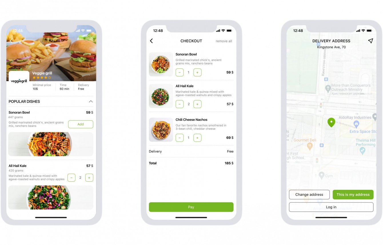 iOS приложение собирает информацию о кафе и ресторанах города и предоставляет пользователям возможность заказать из них еду. Адрес доставки может быть введен вручную или задан с помощью карты.