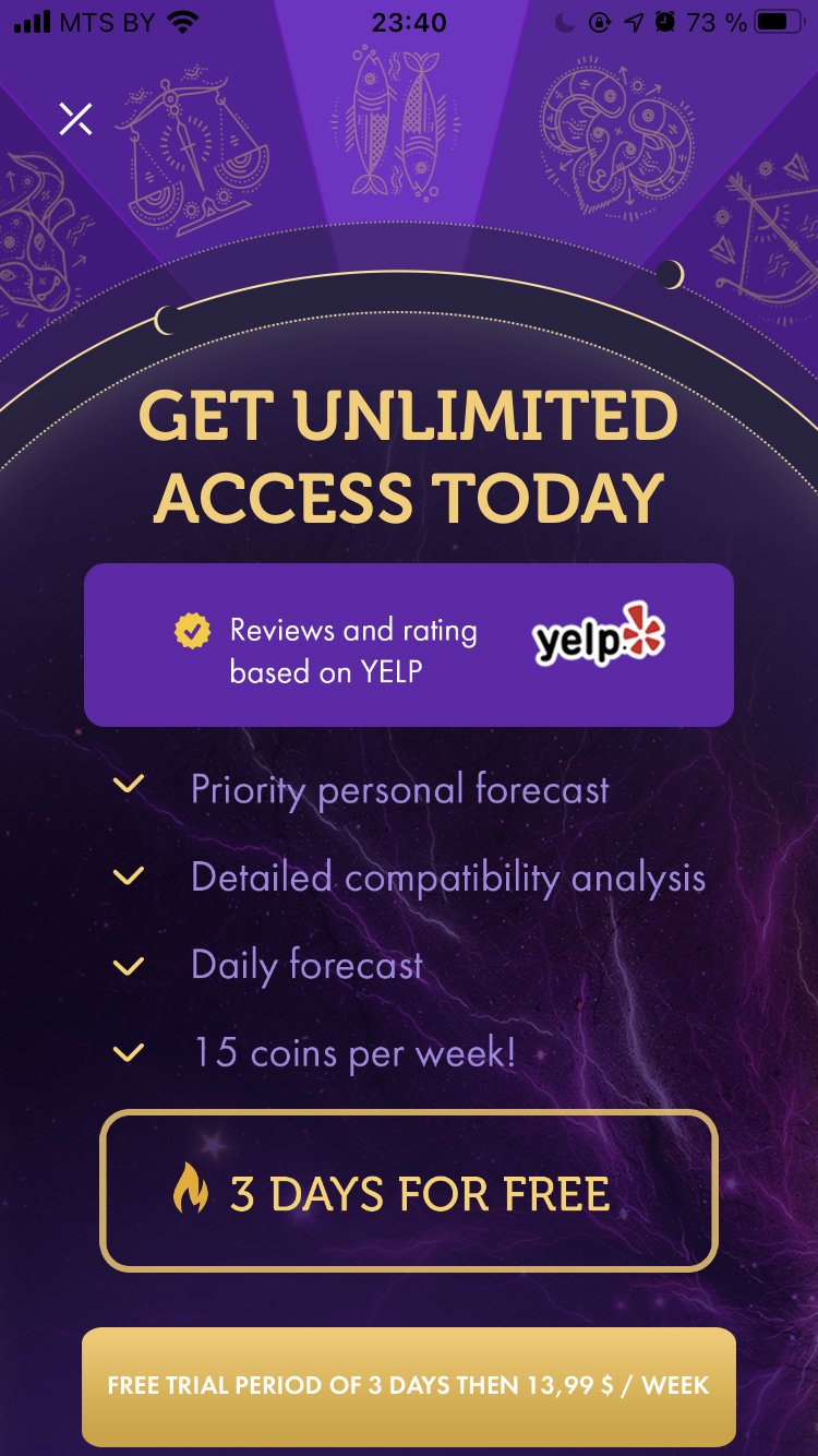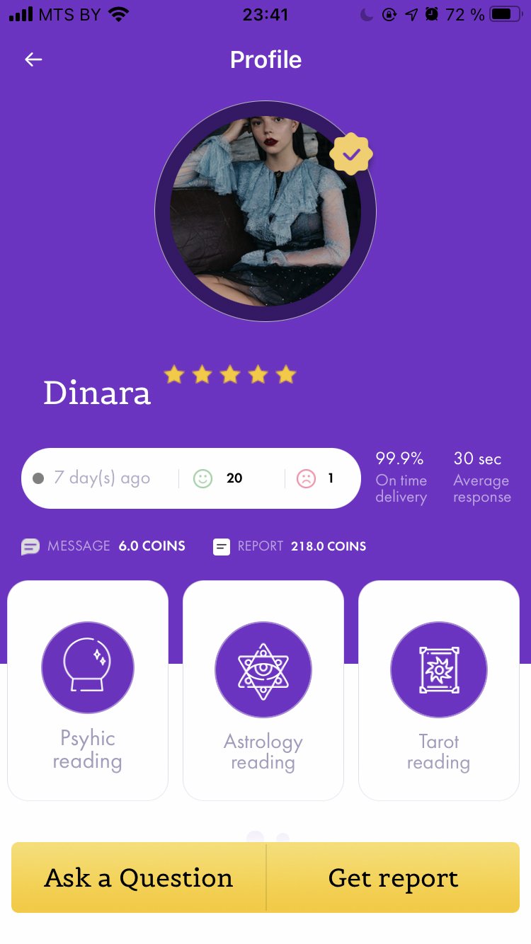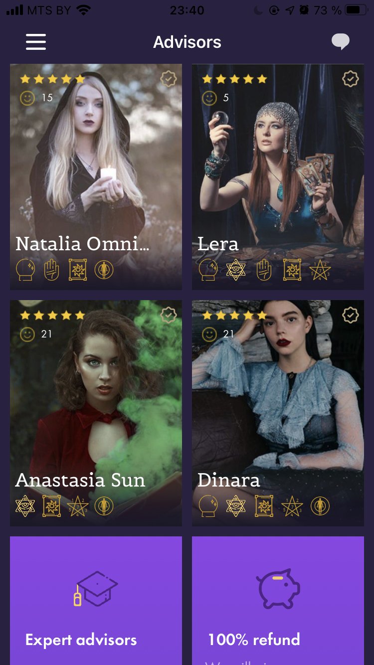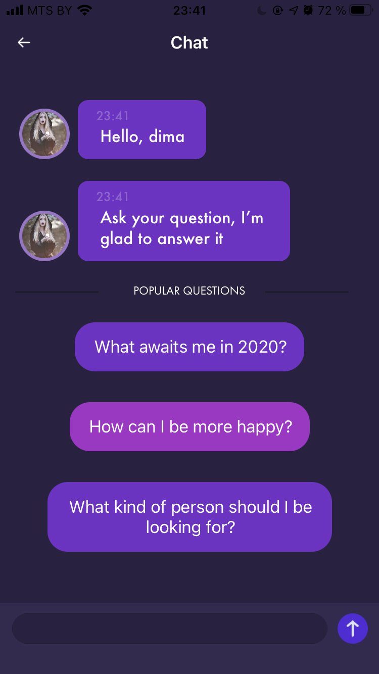 Задача: создать мобильное приложение, где пользователь общается с хиромантами и может посмотреть гороскоп на каждый день.