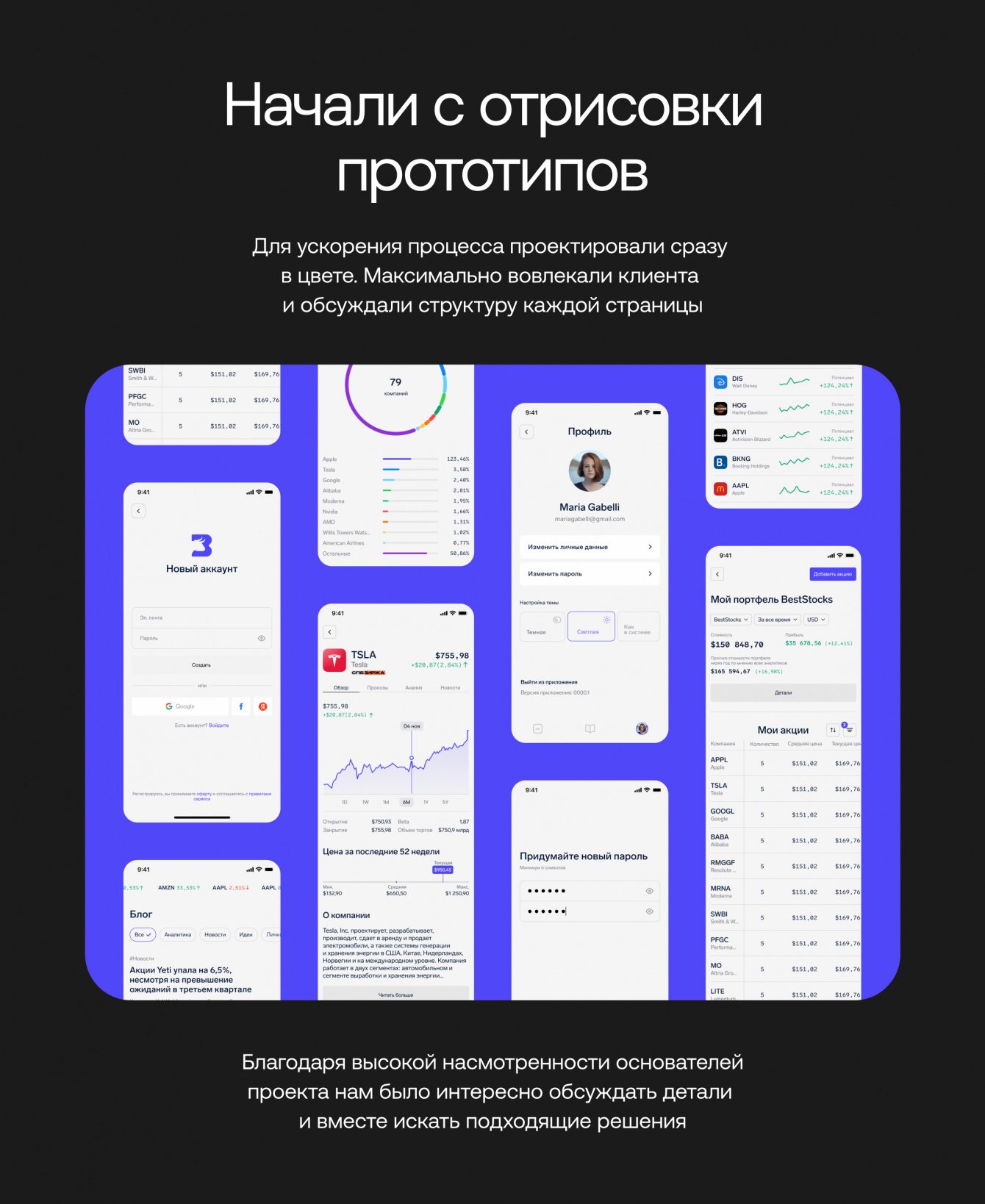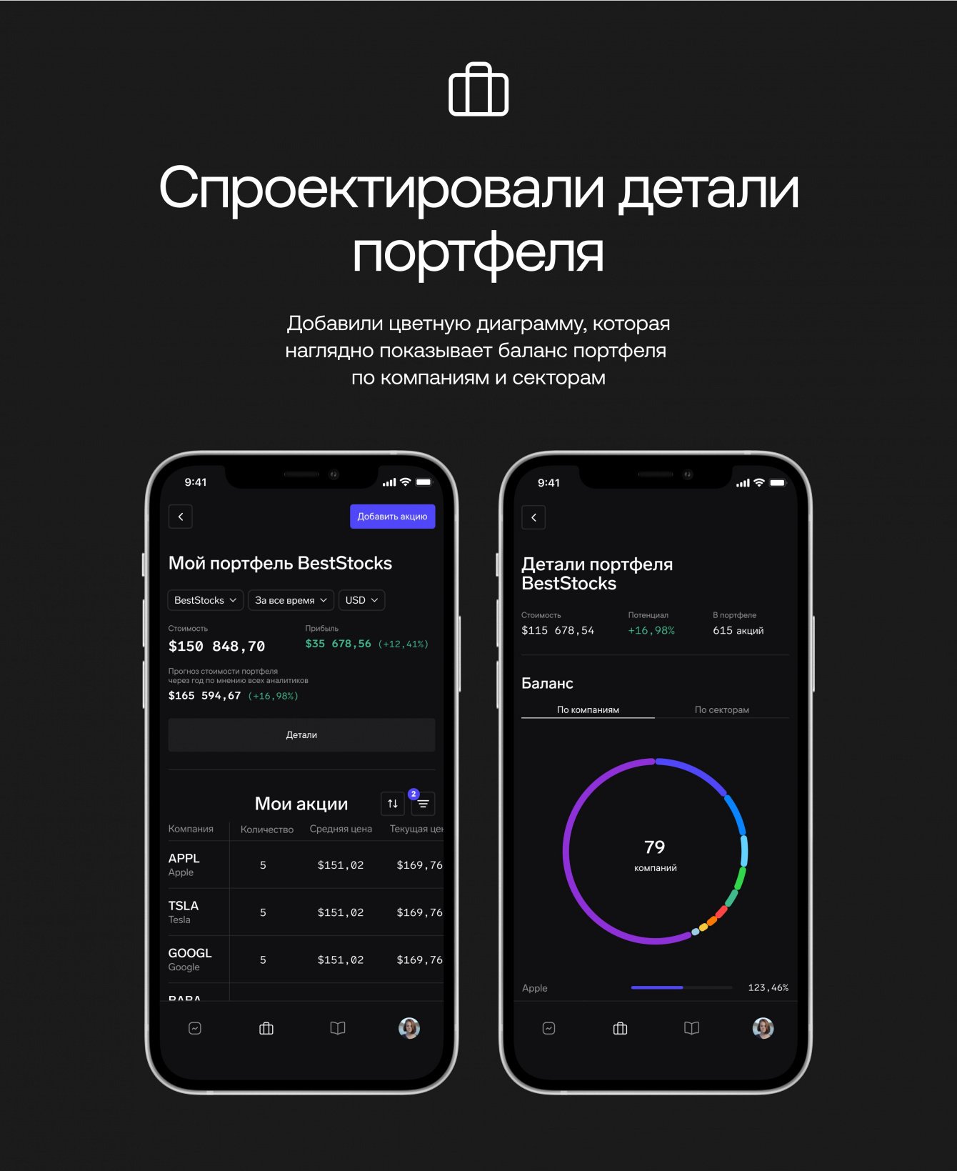 • Спроектировали детали портфеля. Добавили цветную диаграмму, которая наглядно показывает баланс портфеля по компаниям и секторам.
