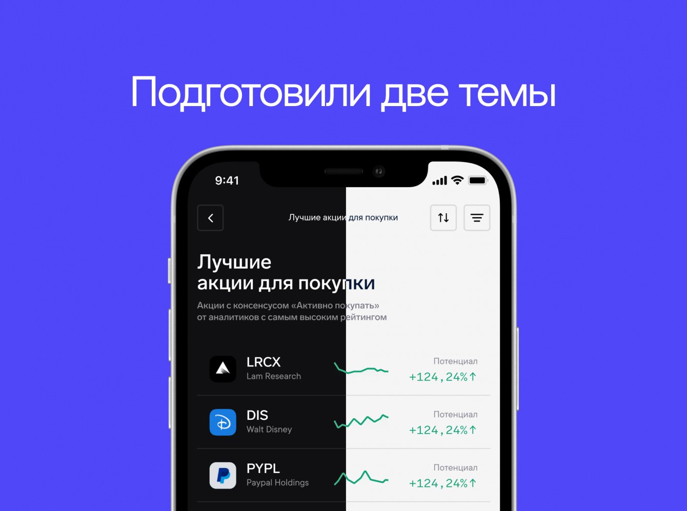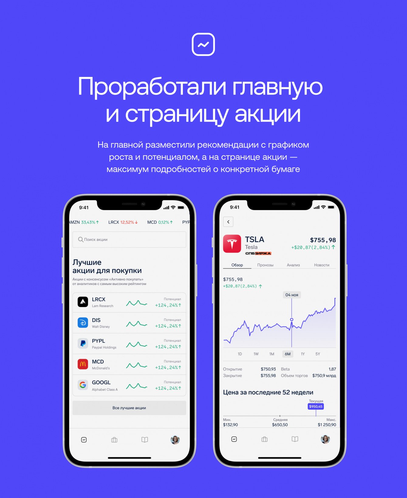 • Проработали главную и страницу акции. На главной разместили рекомендации с графиком роста и потенциалом, а на странице акции — максимум подробностей о конкретной бумаге.