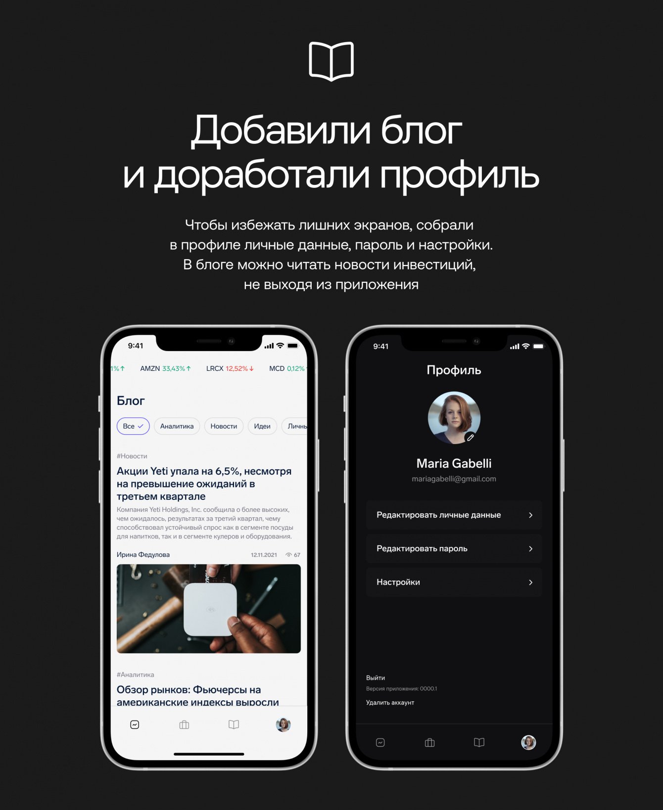 • Добавили блог и доработали профиль. Чтобы избежать лишних экранов, собрали в профиле личные данные, пароль и настройки. В блоге можно читать новости инвестиций, не выходя из приложения.