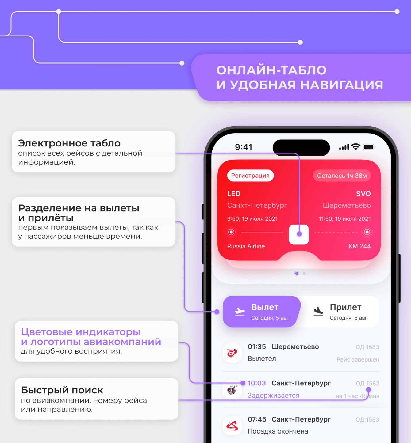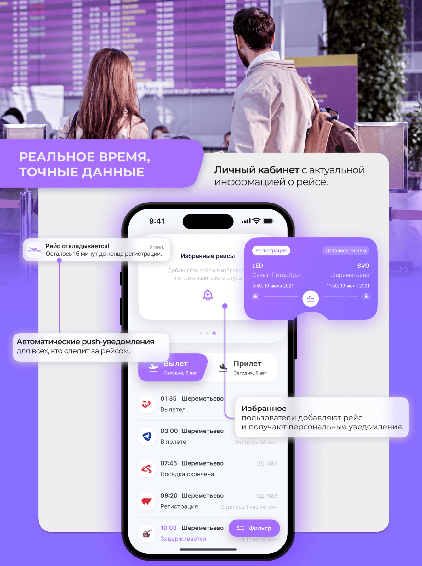 Мы настроили сложную интеграцию с внутренней системамой аэропорта, чтобы пассажиры могли в реальном времени видеть обновления на физическом табло аэропорта.