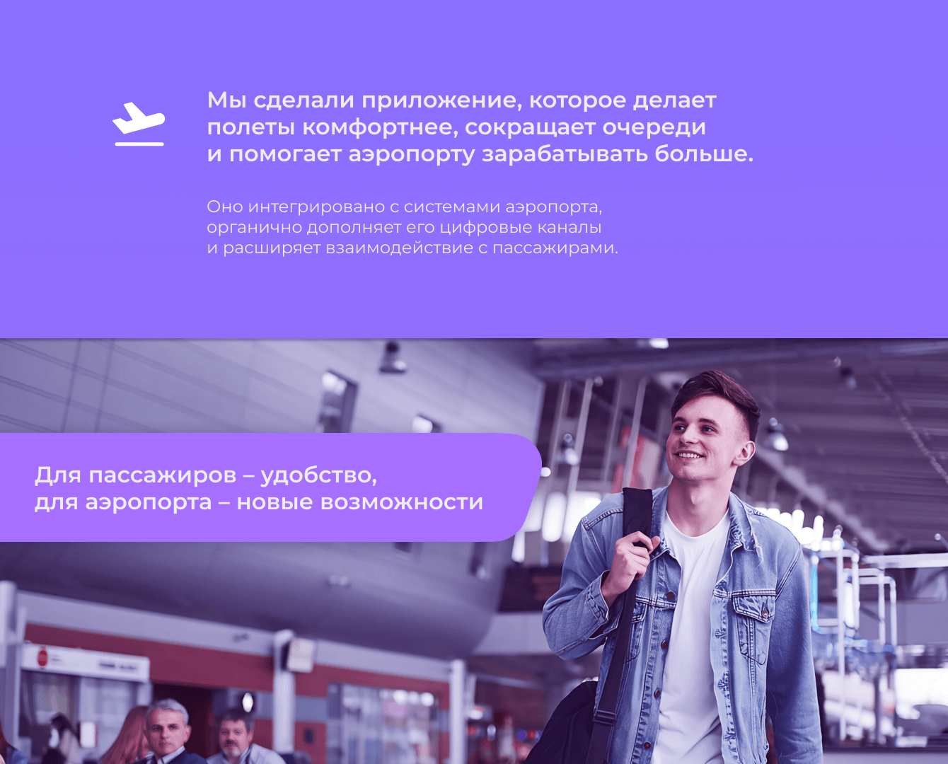 Мы создали приложение, которое нужно каждому аэропорту и пассажиру. Оно делает полеты комфортнее, сокращает очереди, увеличивает продажи услуг и помогает аэропорту зарабатывать больше.