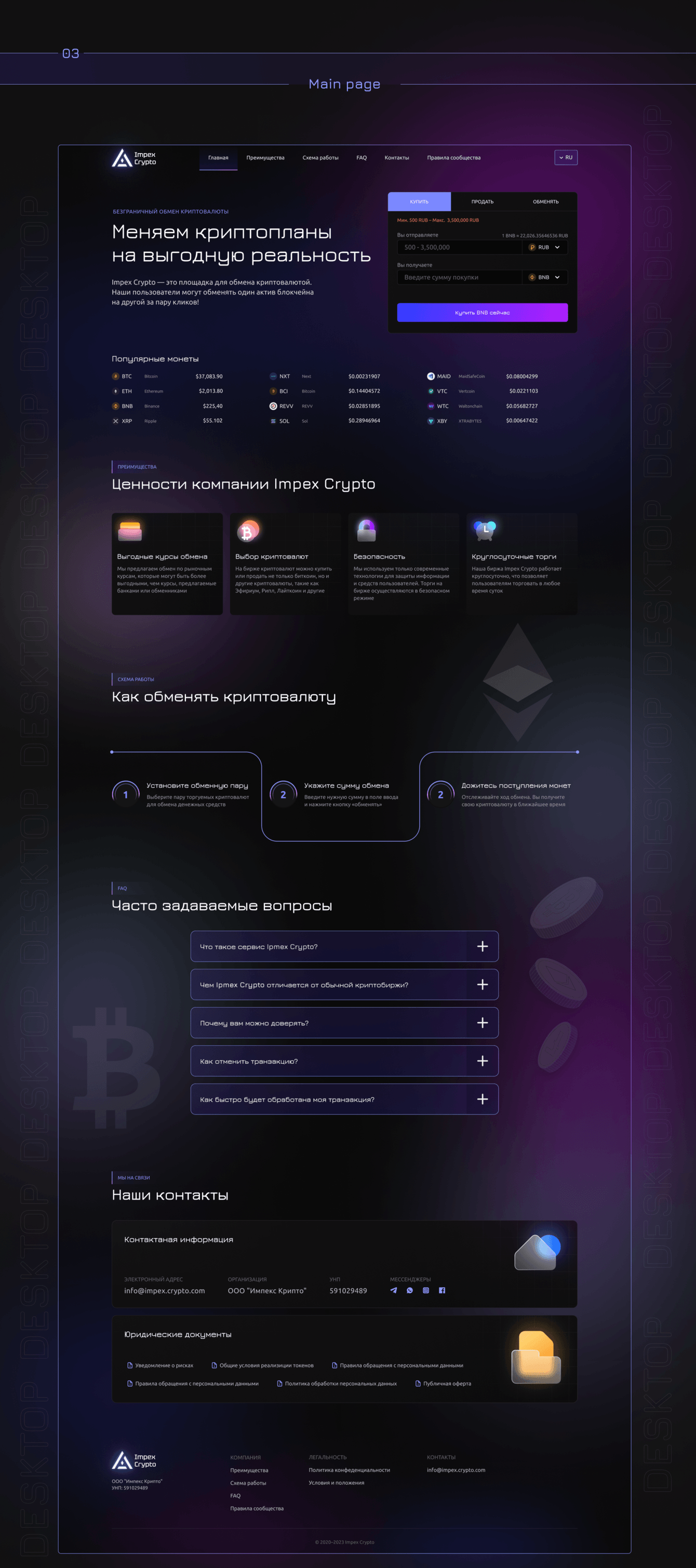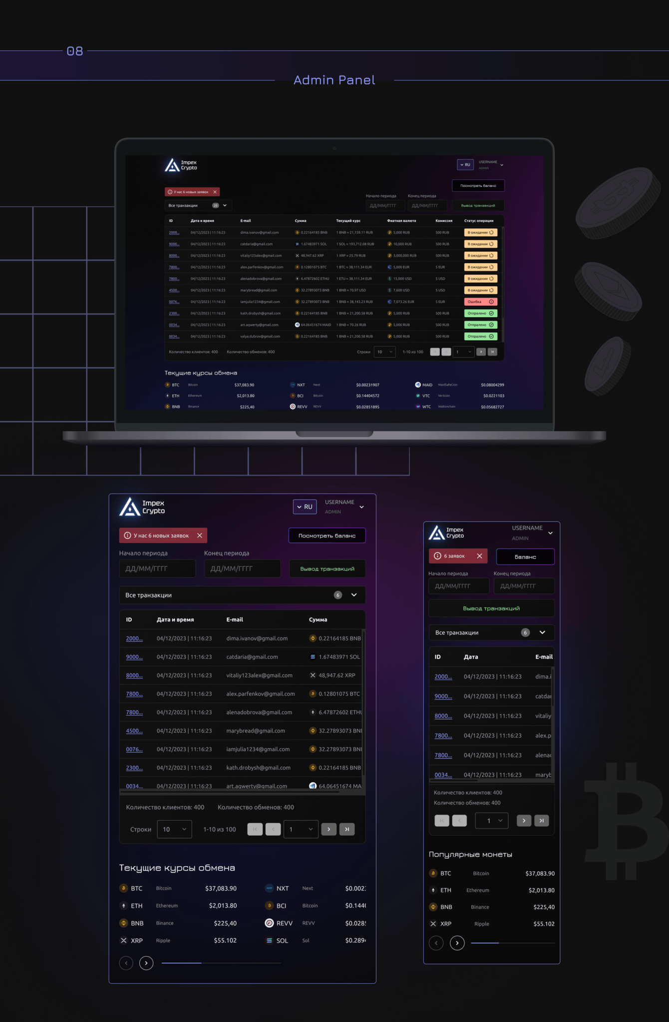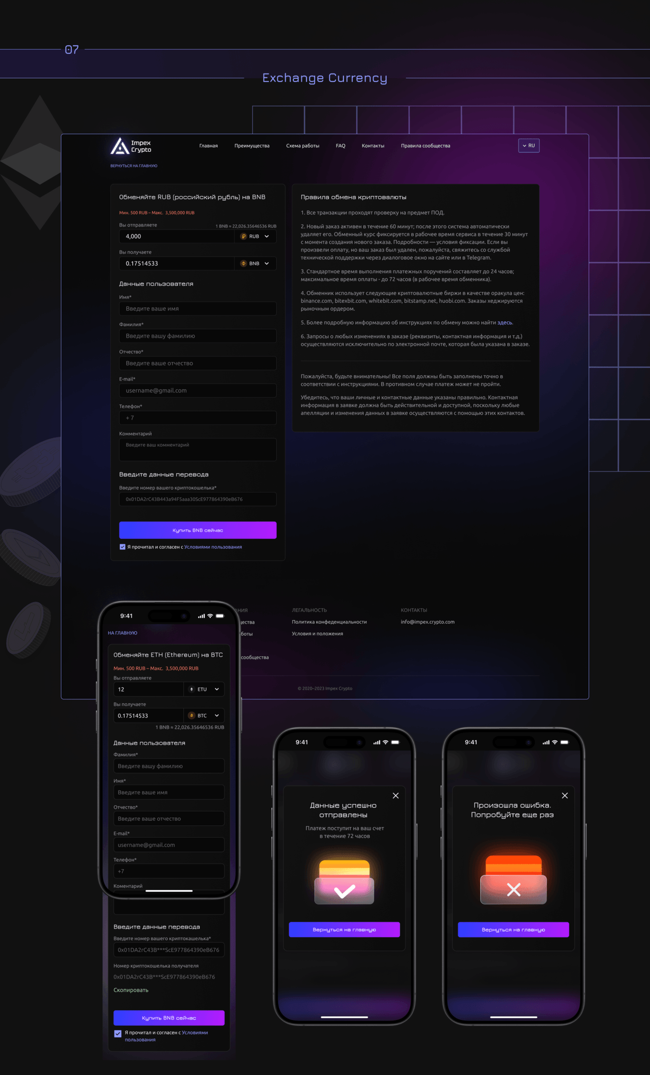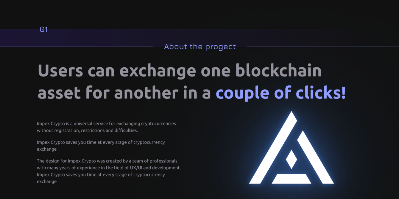 Impex Crypto — это универсальный сервис для обмена криптовалют, который стремится устранить сложности, связанные с регистрацией, ограничениями и сложными процессами. Основной задачей проекта было создать приложение, которое обеспечит: