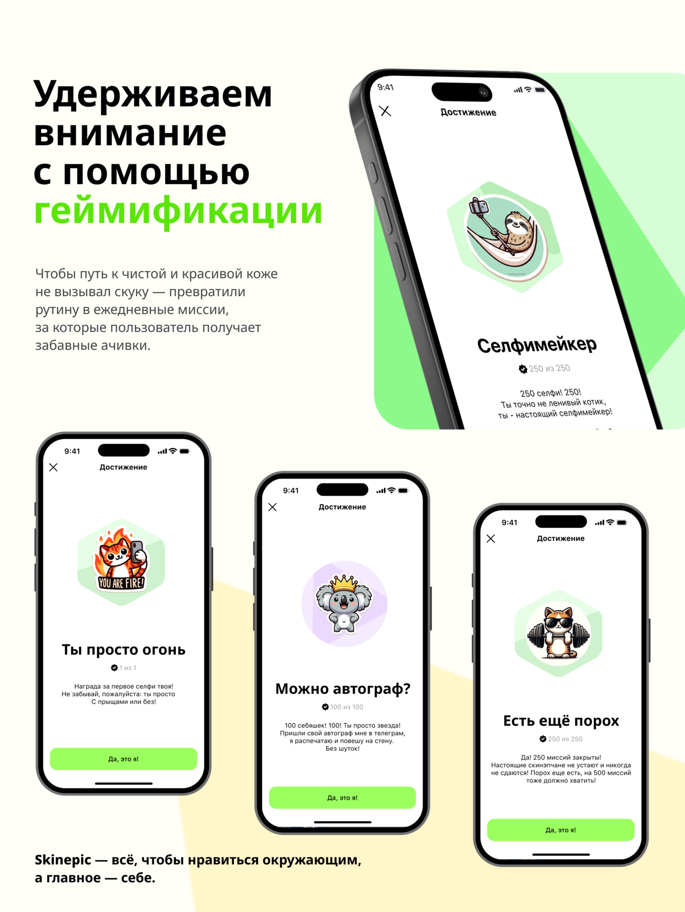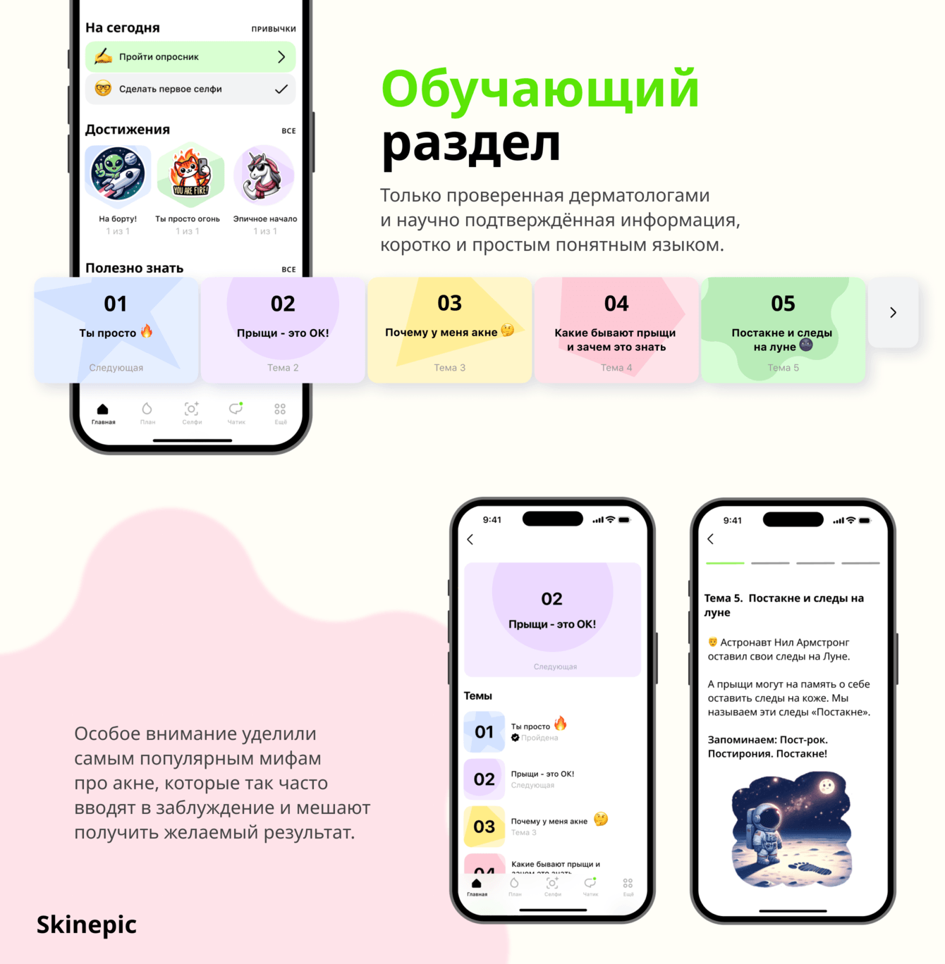 Skinepic – не просто приложение, а личный digital-коуч для здоровой кожи. Мы совместили передовые технологии, образовательный контент и геймификацию, чтобы помочь людям справиться с акне и обрести уверенность в себе.