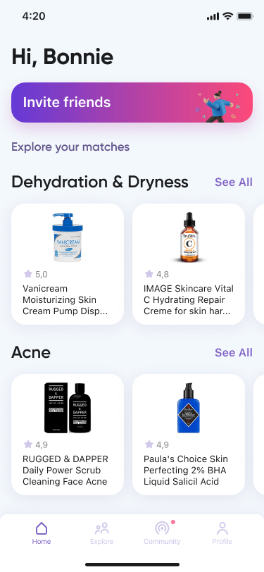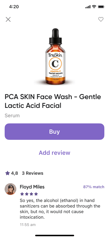 Предлагаем подбирать косметику на основе опыта и отзывов твоих Beauty Twins - людей с таким же типом кожи, похожими проблемами и лайфстайлом. Отзывы таких пользователей будут в разы релевантнее отзывов на маркетплейсах.